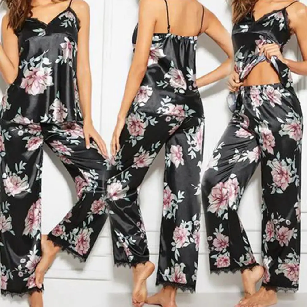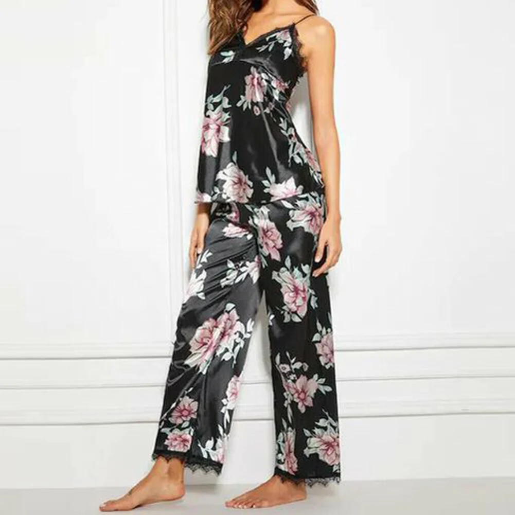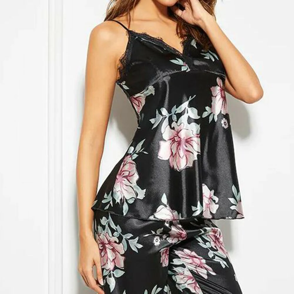 2 шт леди v-образным вырезом цветочный принт кружева жилет брюки на бретелях одежда для сна Сексуальная ночнушка пеньюар