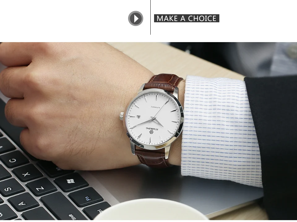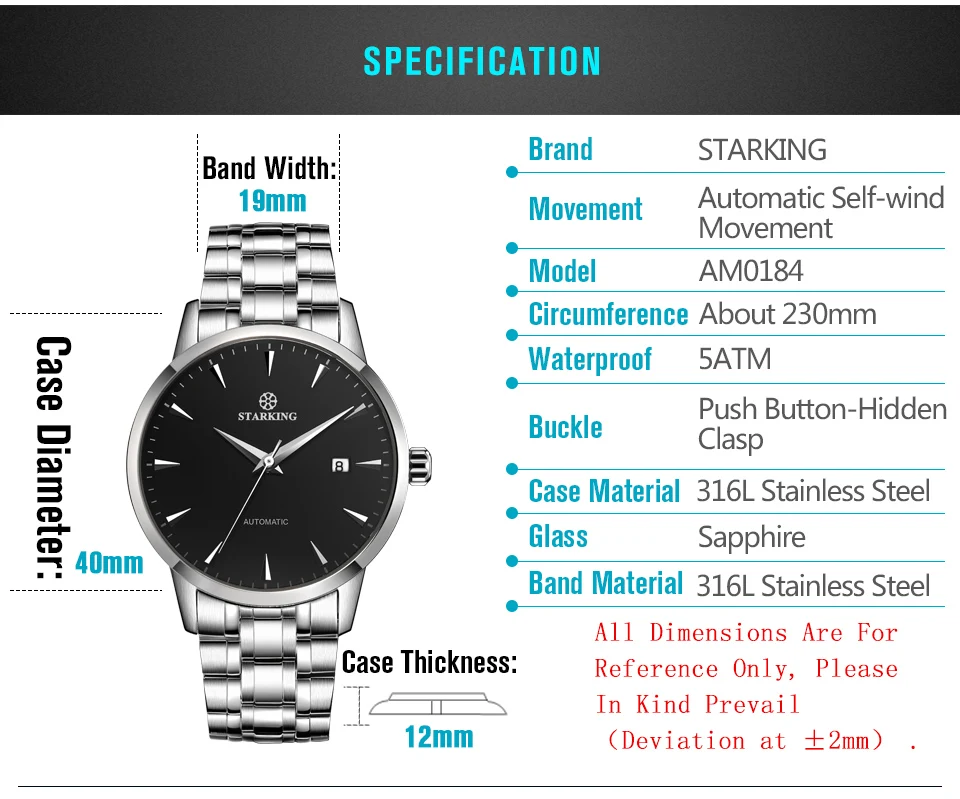 MATERIALS -Model No:AM0184 - 316L Stainless steel case - Genuine Leather strap - Automatic mechanical movt - Sapphire Crystal Glass - 50M water resistant - Auto date function -12 Months Warranty SIZE -Case diameter: 40mm -Case thickness: 12mm -Strap width: 20mm -Strap length: 230mm