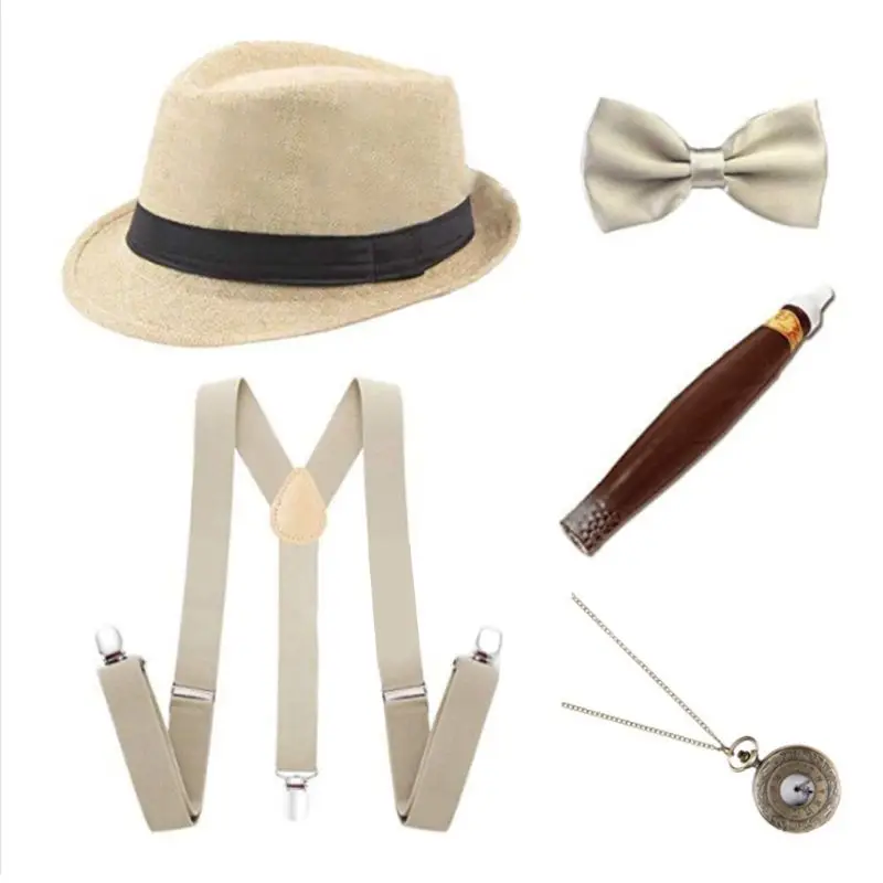 Каждый набор мужских аксессуаров 1920 s включает в себя: 1 Кепка/берет, 1 y-образные подтяжки, 1 галстук-бабочка, 1 пластиковая сигара, 1 карманные часы. (Только аксессуар для костюма, на самом деле не работает).