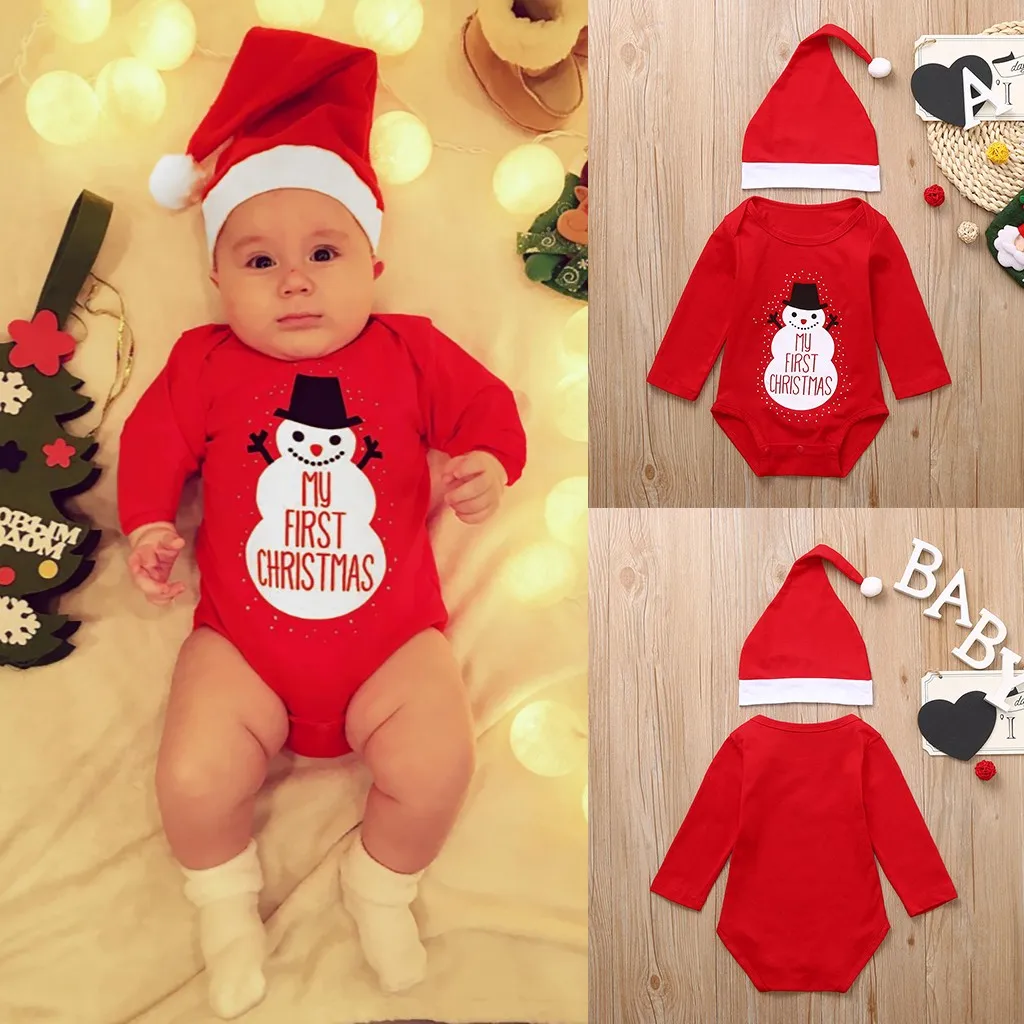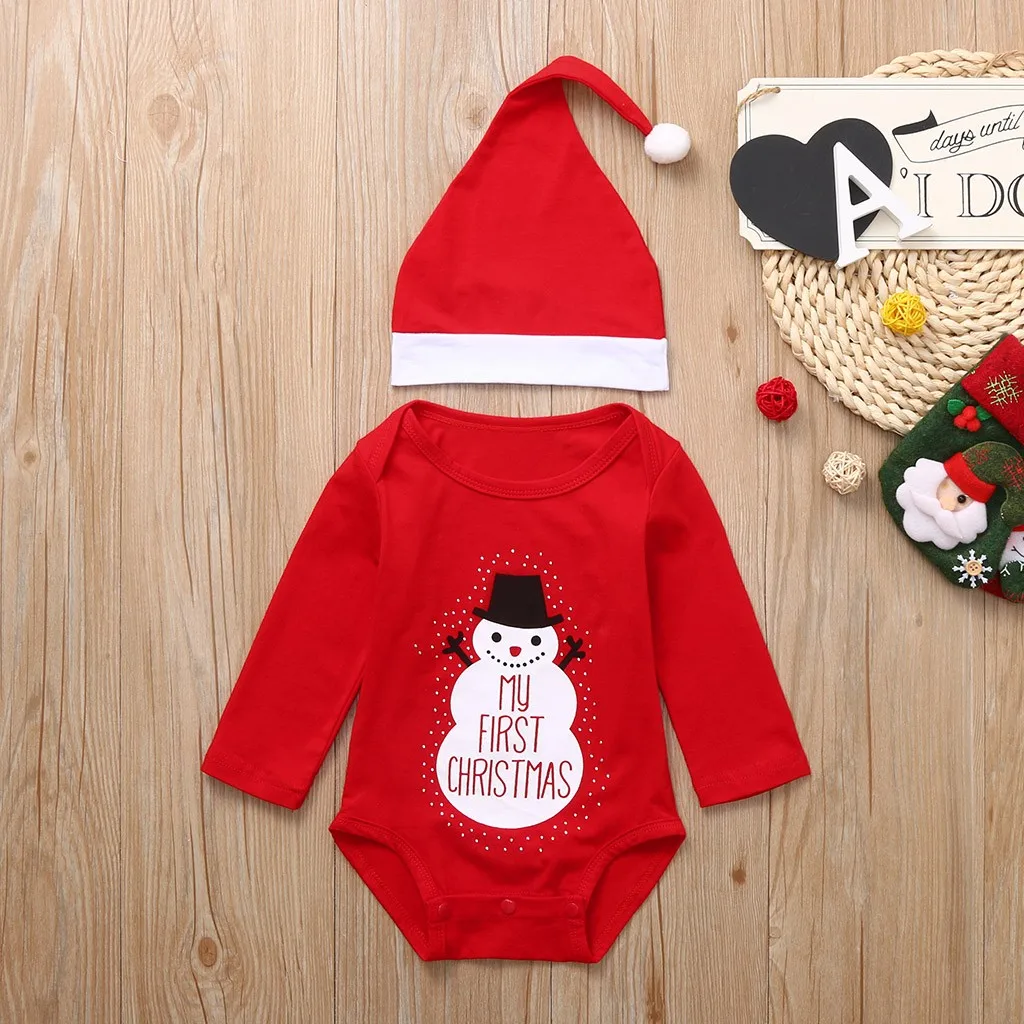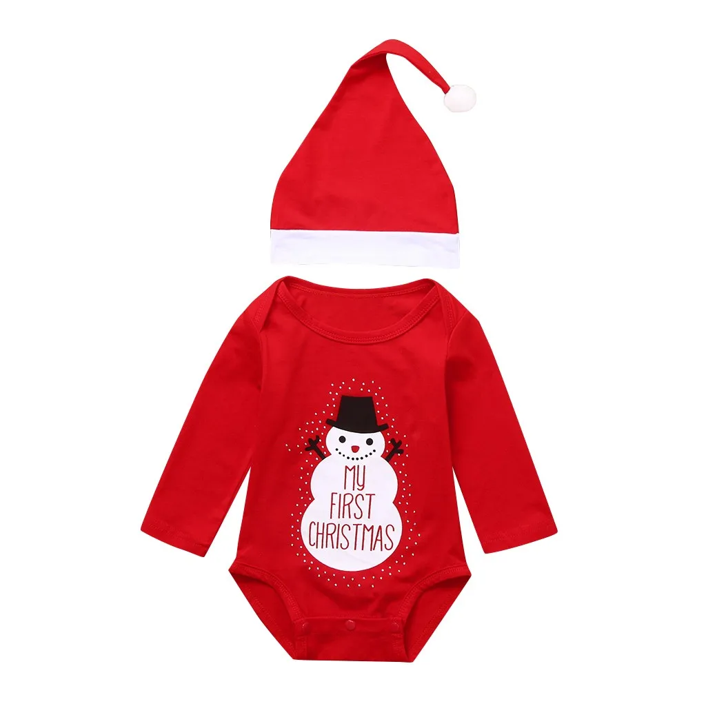 Christmas Toddler Baby Cartoon Letter Snowman Print Romper+Hat Clothes Set Suit lovely baby clothes christmas winter jumpsuit