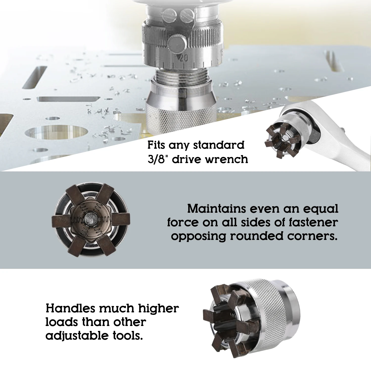 Заменяет более 30 розеток от 3/8 "до 3/4" и от 10 до 19 мм.