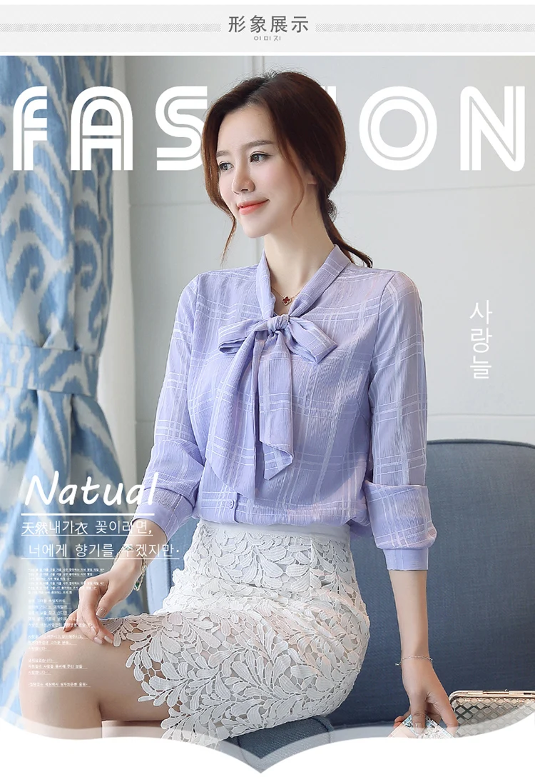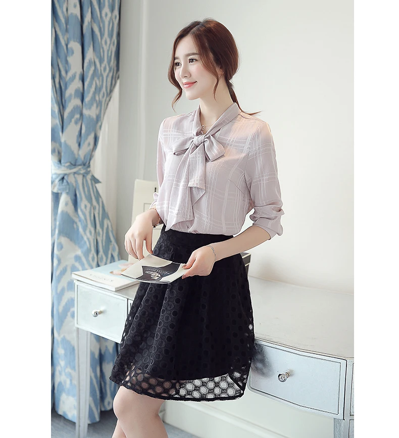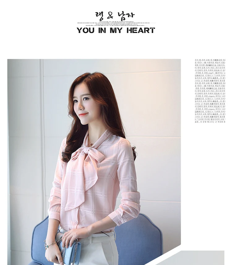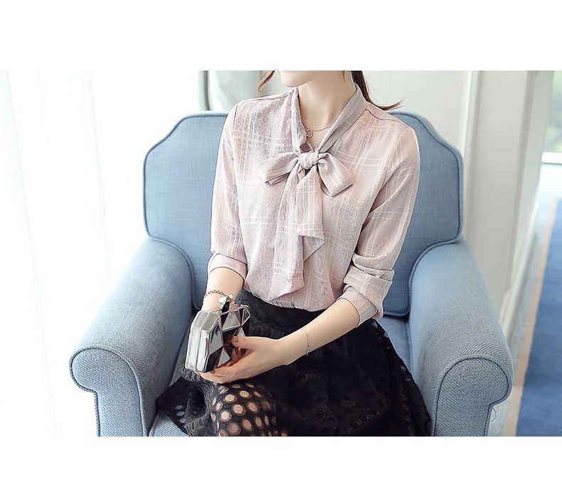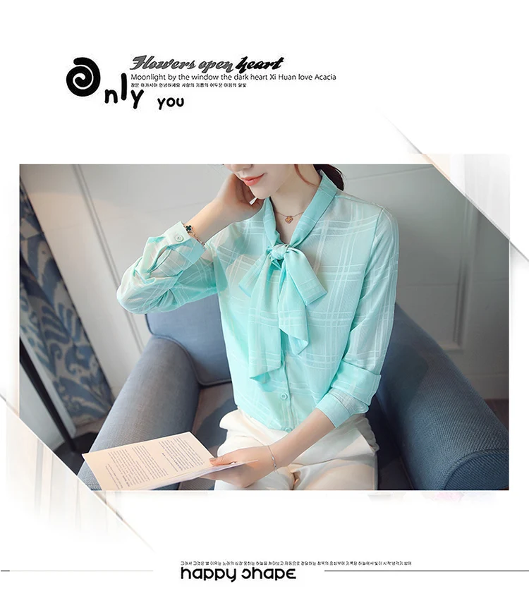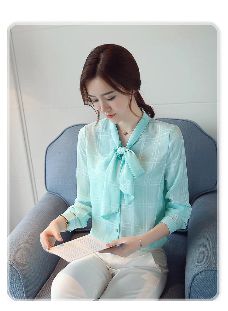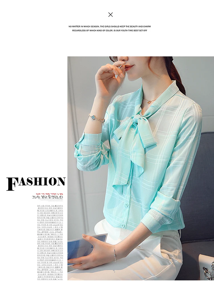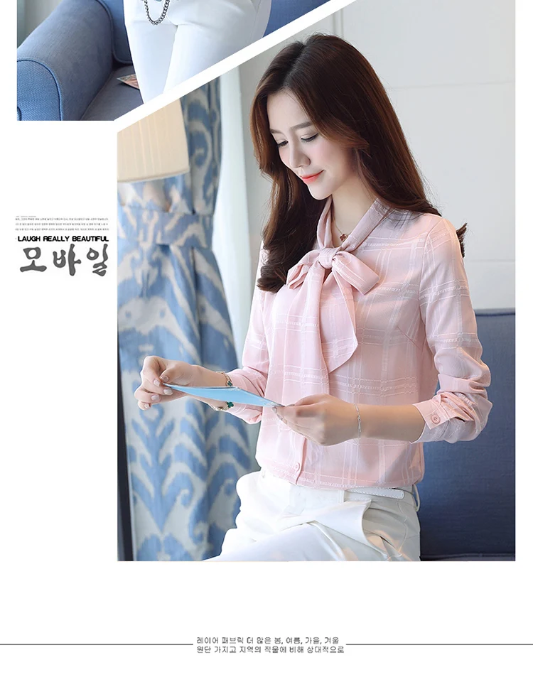 Clobee весна полный рукав с бантом плед рубашки блузки Новое поступление женская элегантная офисная одежда корейские шифоновые рубашки