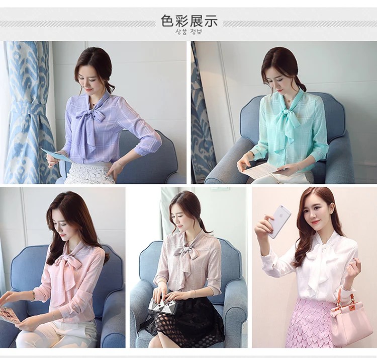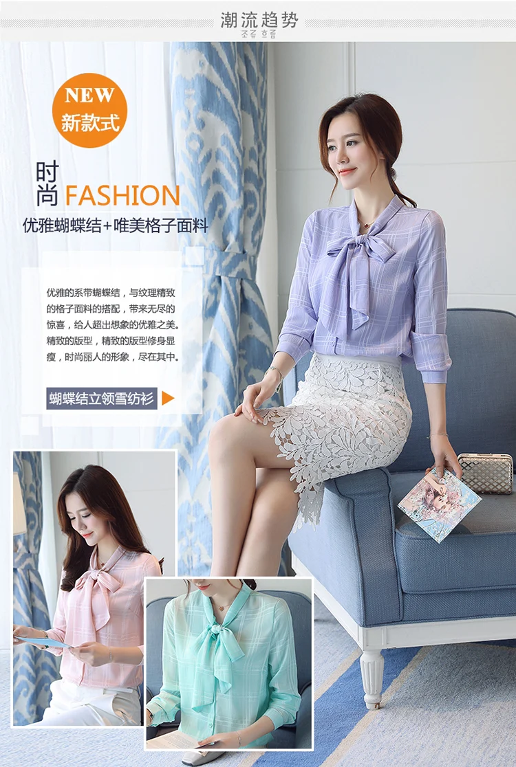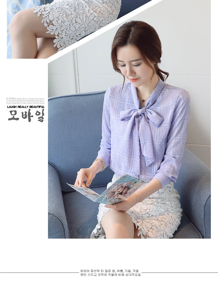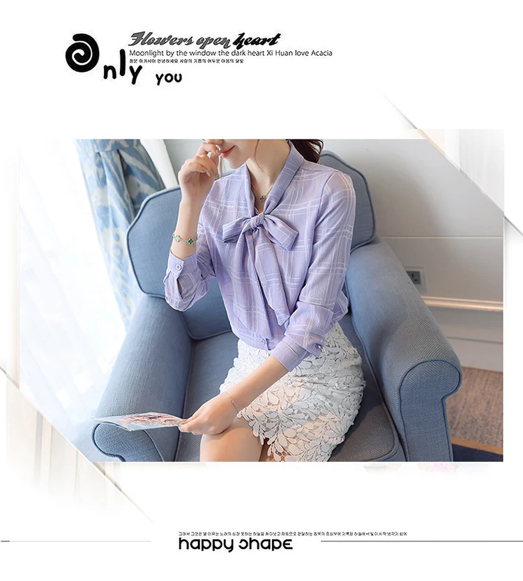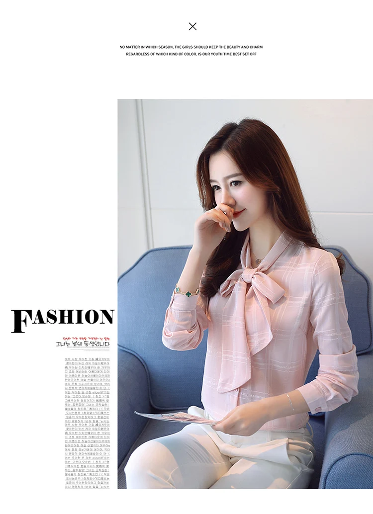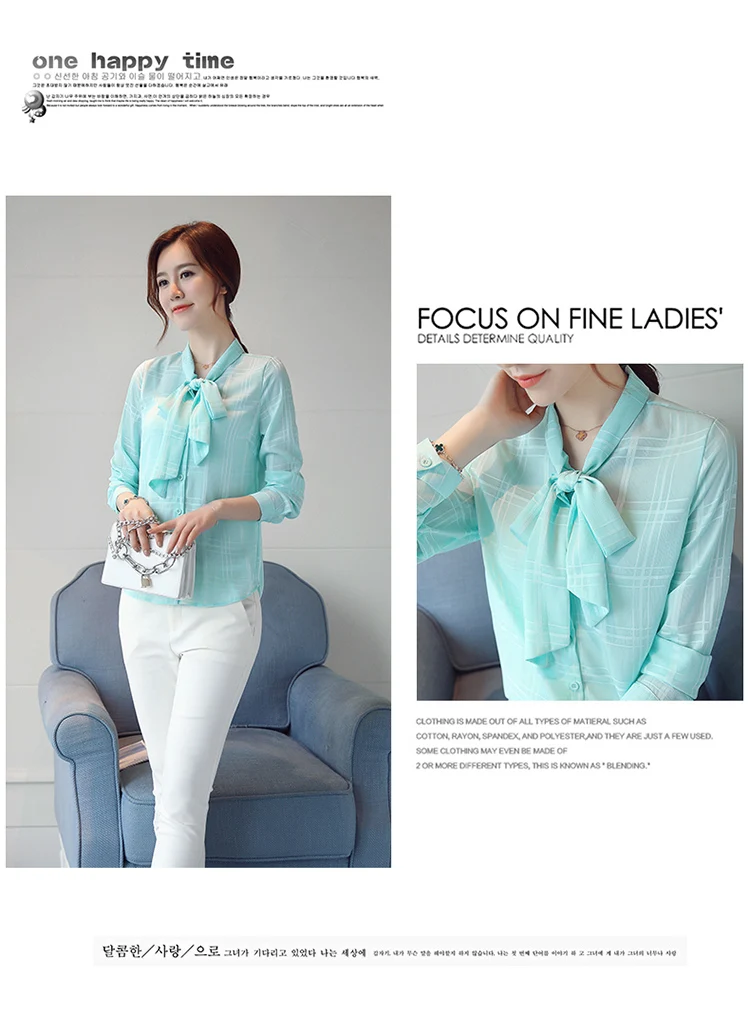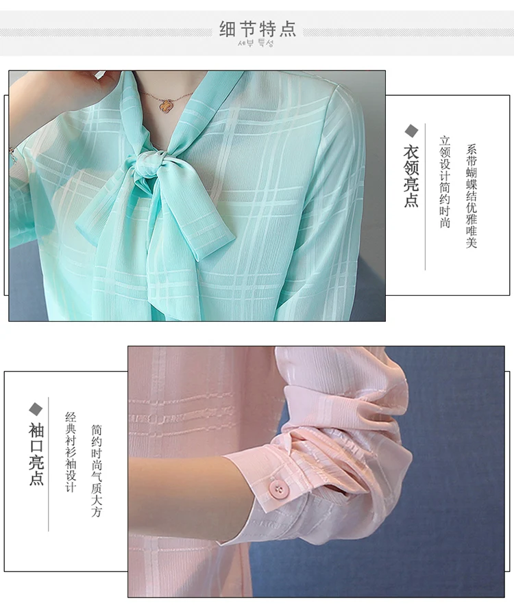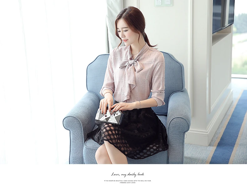 Clobee весна полный рукав с бантом плед рубашки блузки Новое поступление женская элегантная офисная одежда корейские шифоновые рубашки