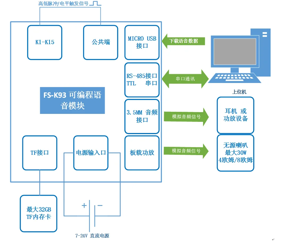 ● Useusbинтерфейс загрузки голоса, просто oneMicro-USBLine(Android mobile data line) Это удобно и эффективно для загрузки голоса и изменения конфигурации модуля, нет верхней компьютерной программы не требуется.