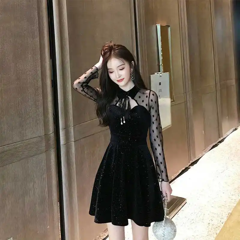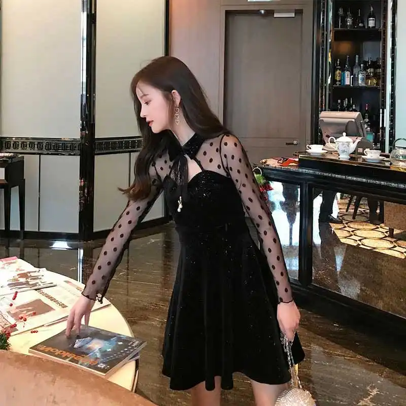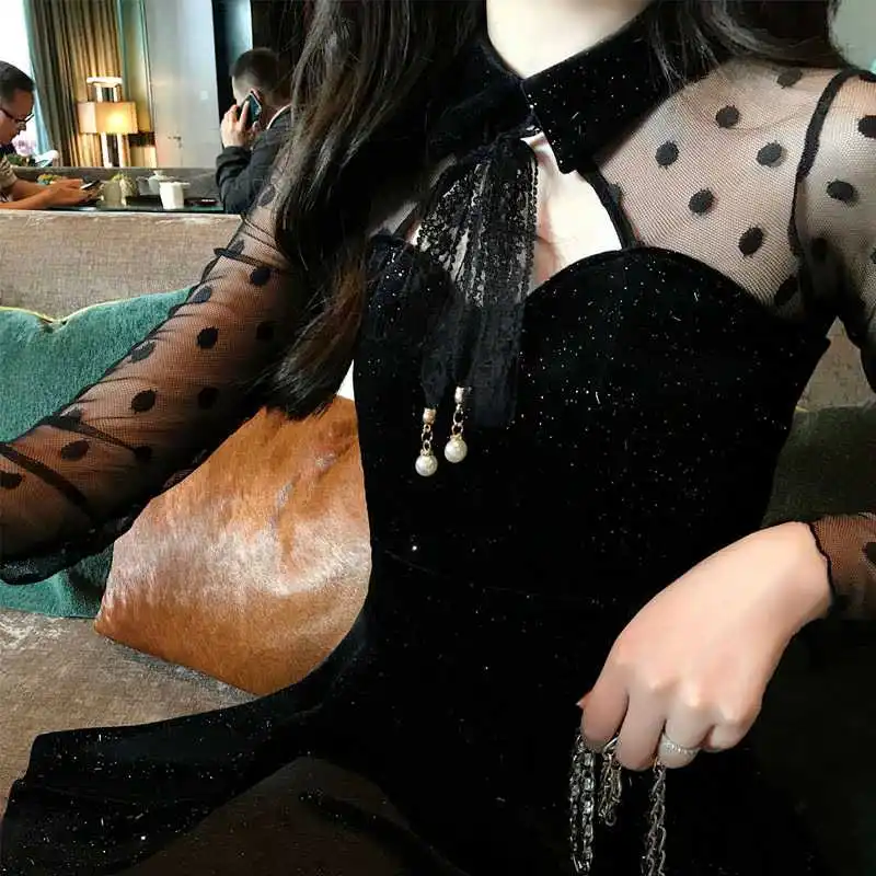 2020 Платья для вечеринок женское маленькое черное платье готическое милое тонкий галстук-бабочка ТРАПЕЦИЕВИДНОЕ Прозрачное платье в горошек DV521