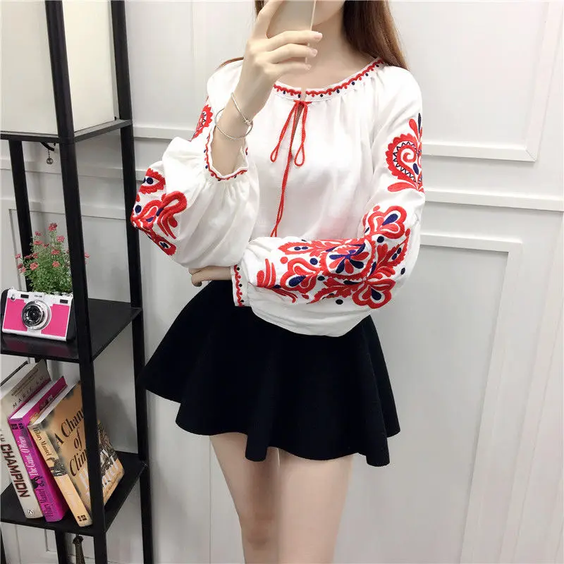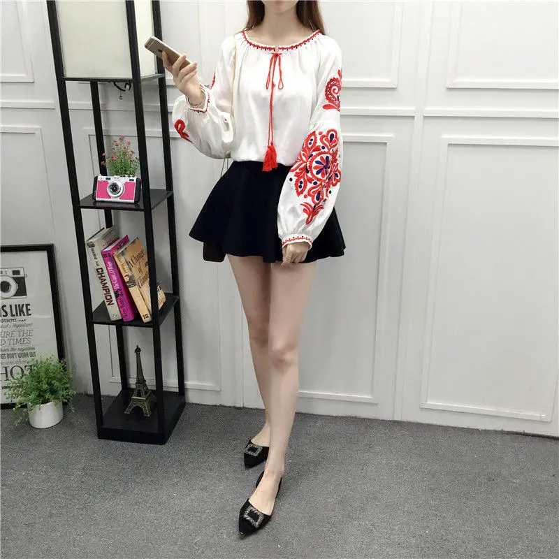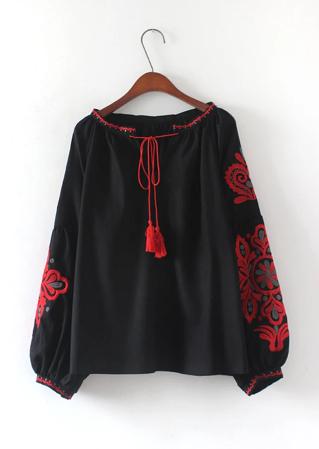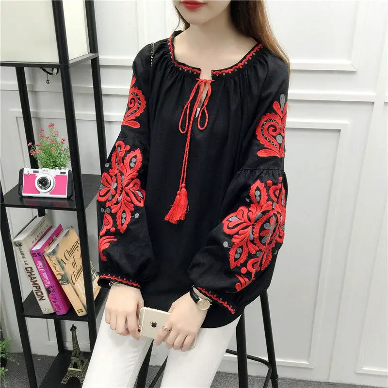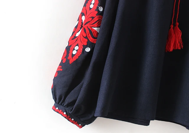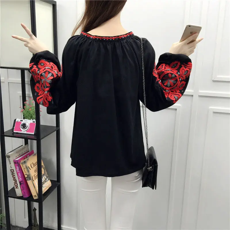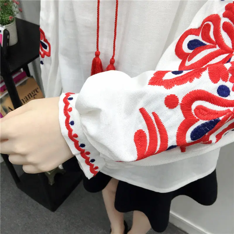 Хлопок Лен Boho вышитые блузки летние с длинным рукавом Женские блузки Белый Синий Черный Повседневная Свободная блузка AF118