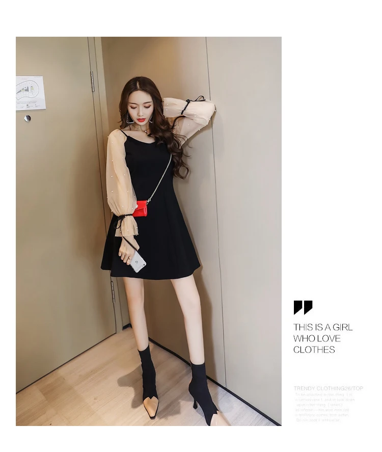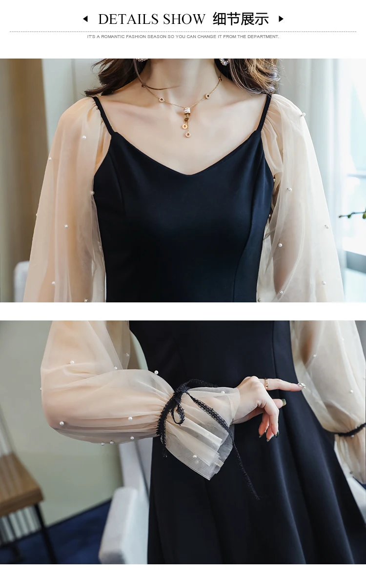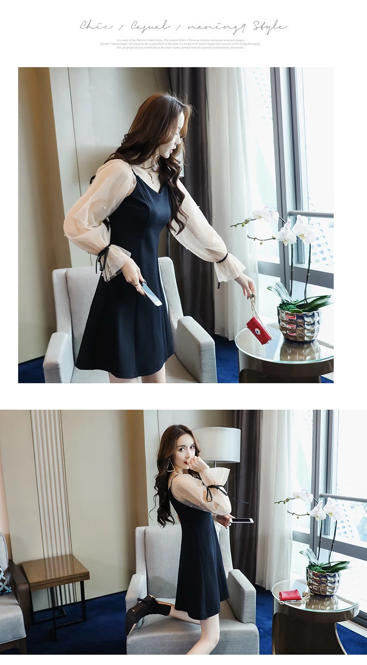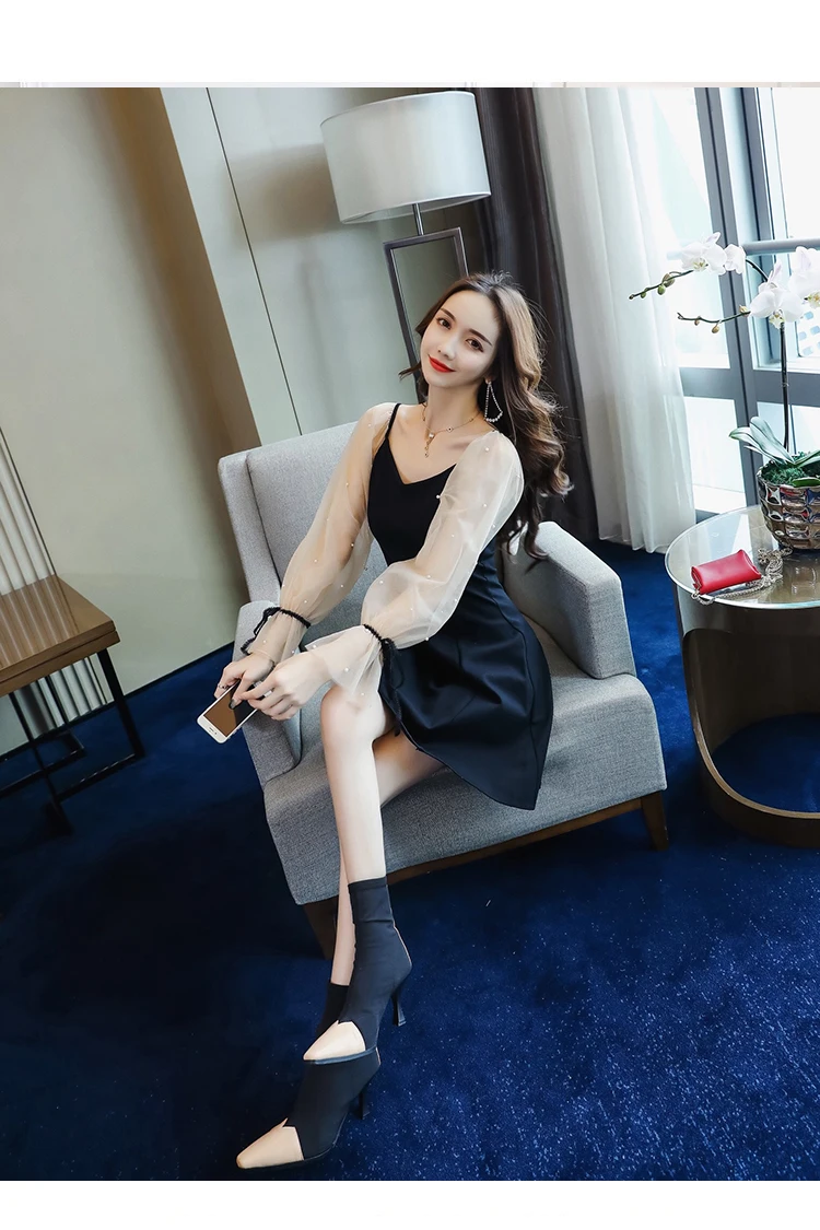 Черное жемчужное Сетчатое платье с пышными рукавами, женское плиссированное платье с v-образным вырезом и длинным рукавом, сексуальное платье 2020, вечерние облегающие мини-платья, элегантное платье AE994