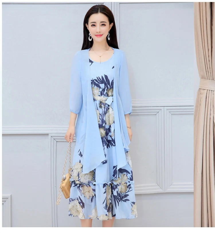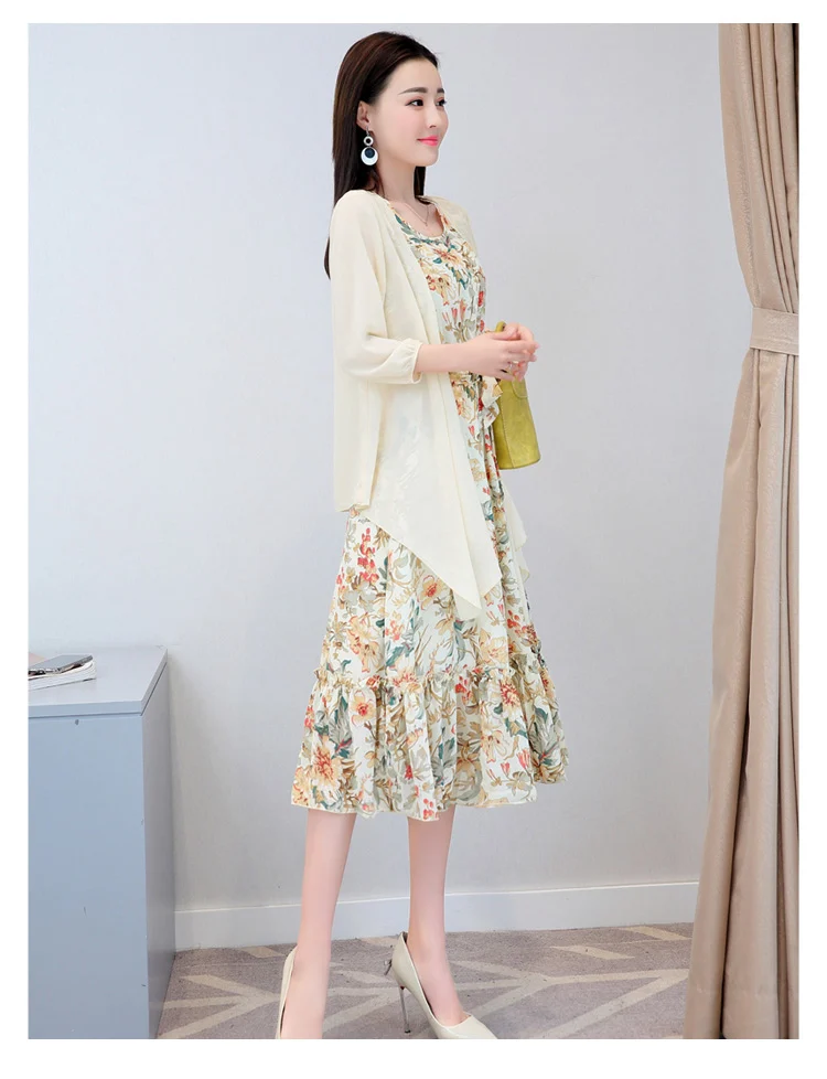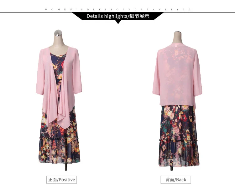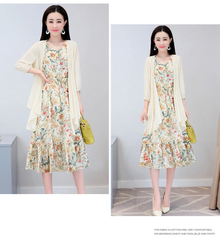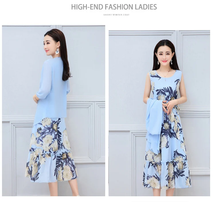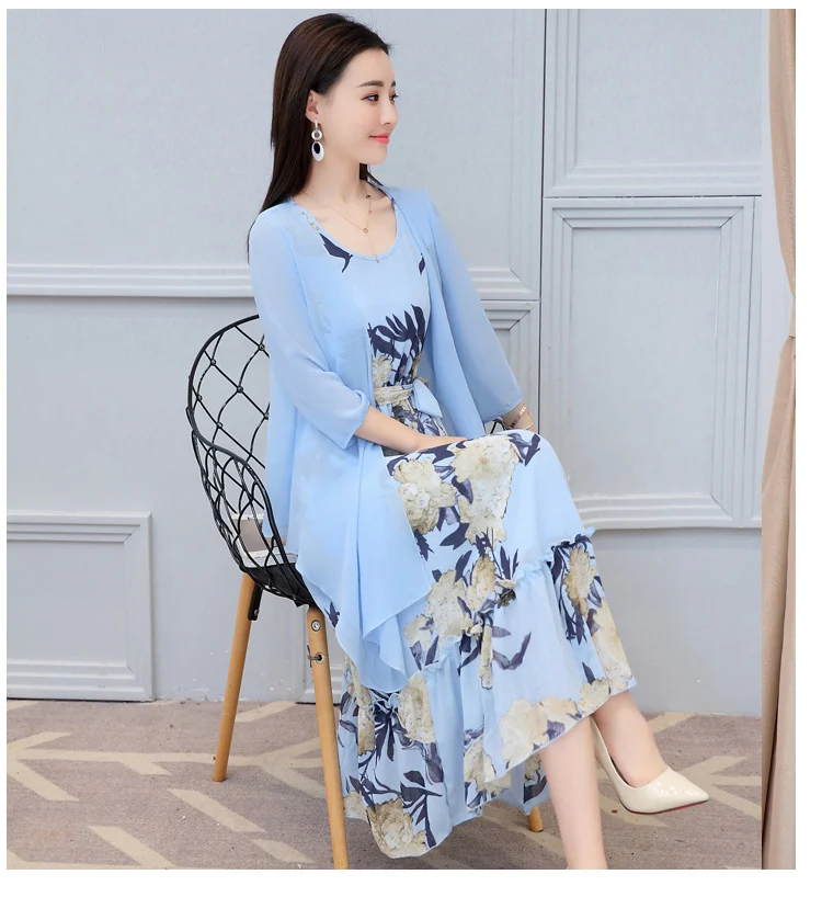 Korean Vintage Print Two Piece Dress Clobee Women Summer Dress Elegant Luxury Ethnic Office Wear Long Chiffon Dress
