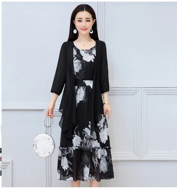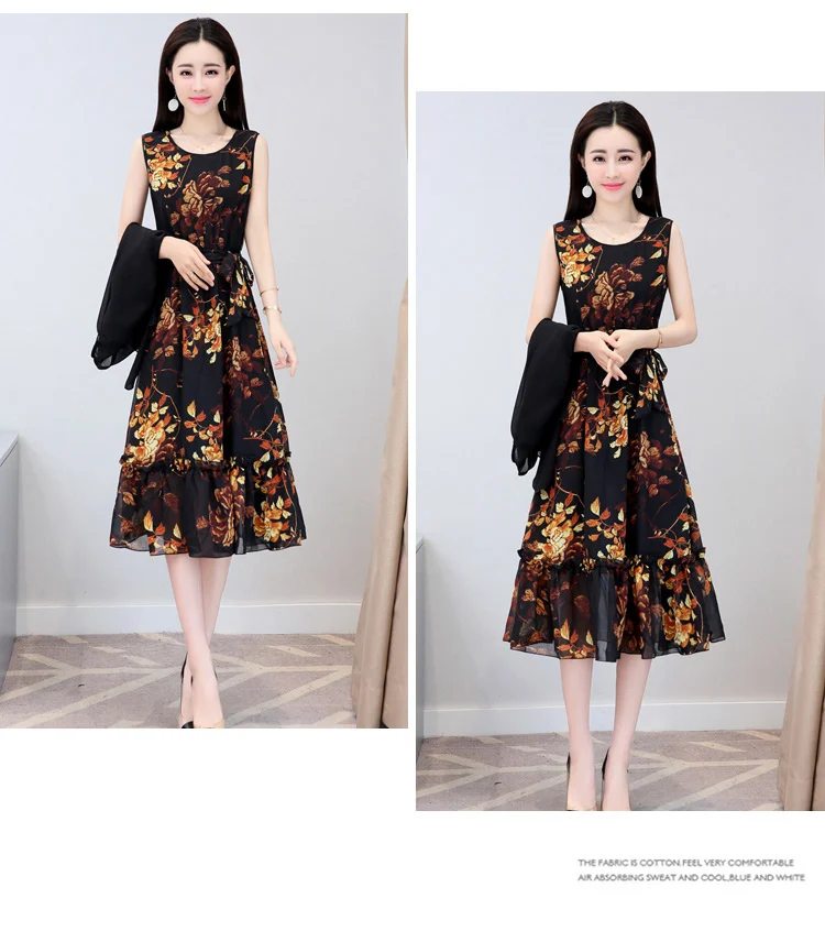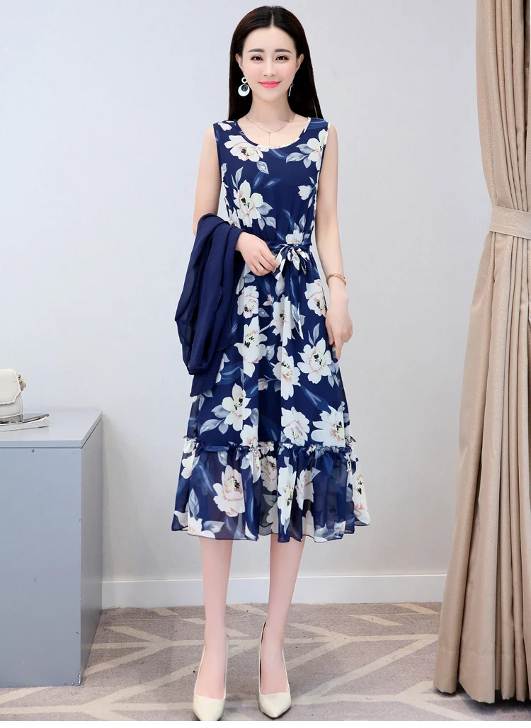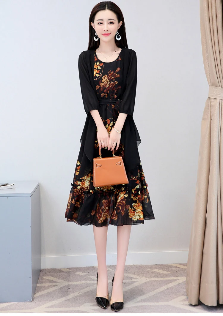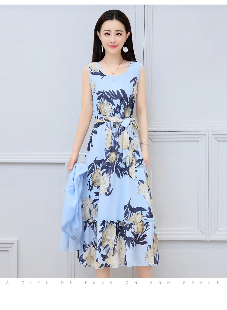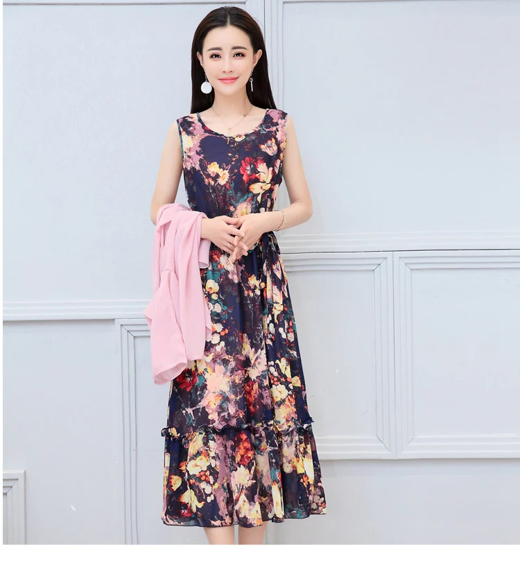 Korean Vintage Print Two Piece Dress Clobee Women Summer Dress Elegant Luxury Ethnic Office Wear Long Chiffon Dress