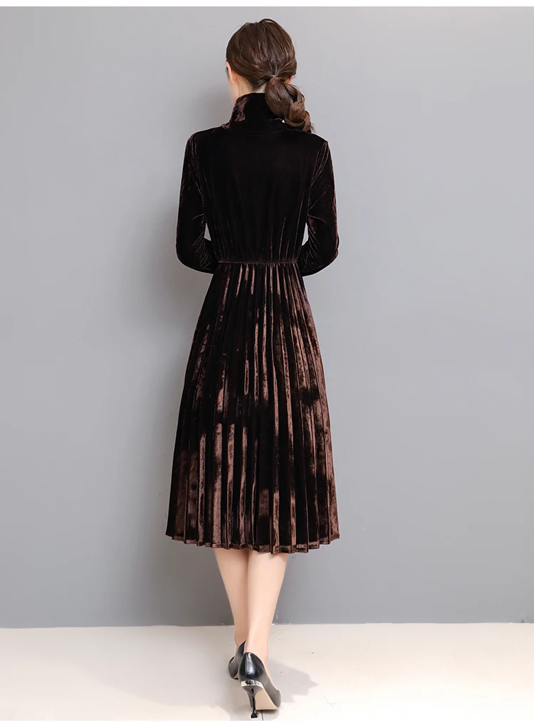 5XL женское зеленое черное бархатное платье, зимнее платье с высоким воротом, винтажное плиссированное платье с длинным рукавом размера плюс, женские платья AQ369