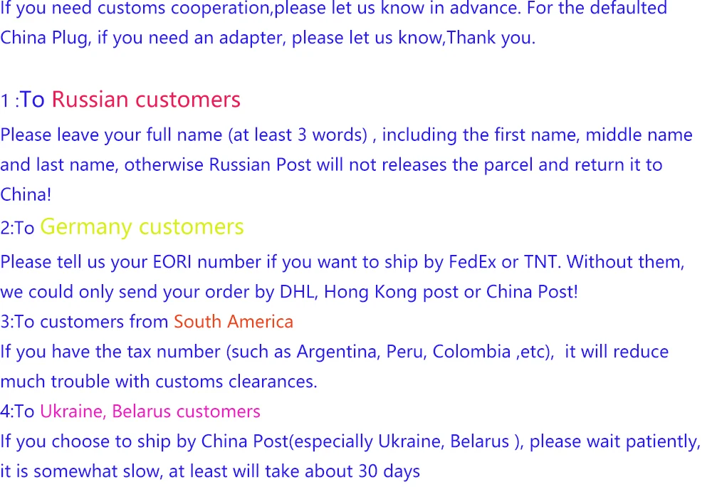 For your convenience, if you need, we could declare your goods as"gift/sample" on the commercial invoice or customs declaration, and we are trying to help you minimize any GST or V.A.T import taxes. But we can not guarantee no Tax charges which depends on your country's policy. We accept Alipay, paypal, etc; full payment shall be done within 19 days after place your order, if not, the order will be closed automatically afterwards. The price you paid for items excluding any customs tax. We do not have any duties in the destination countries.