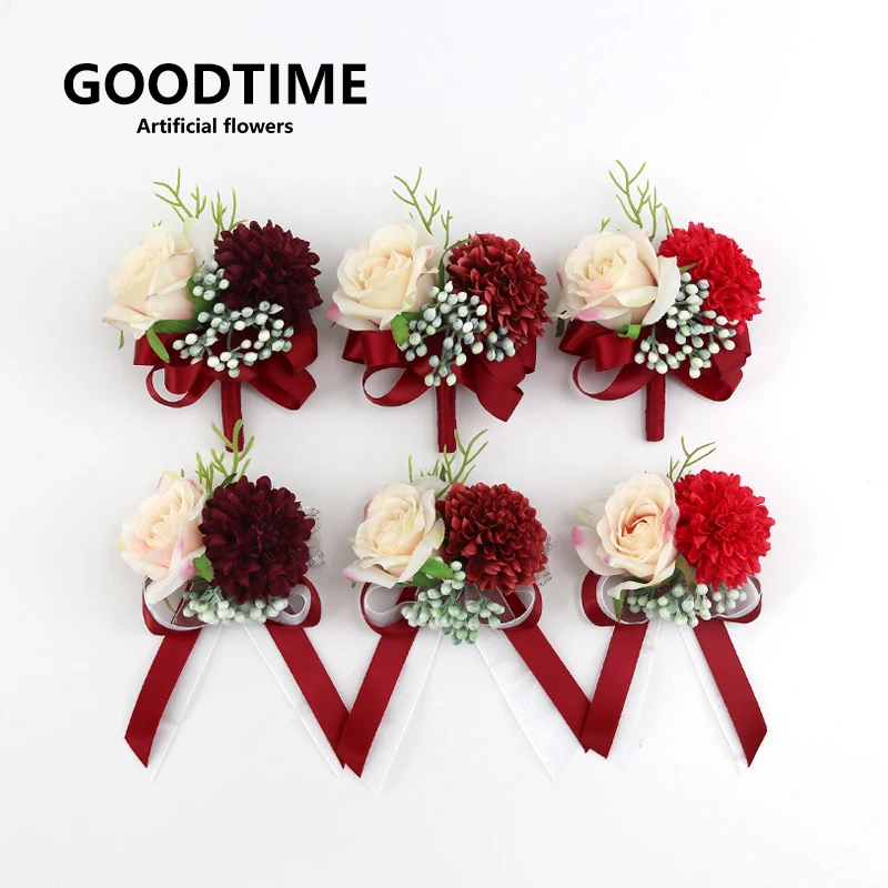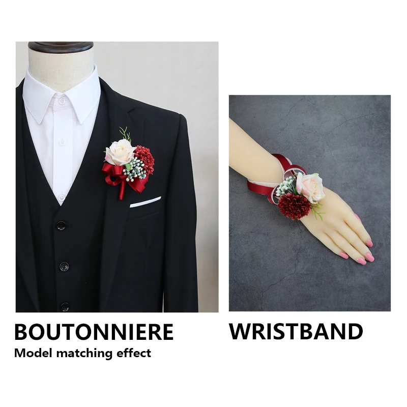 100% новый и высокое качество Тип: Свадебный корсаж на запястье и бутоньерка Цвет: как показано на таблице Посылка включает в себя: 1 свадебная бутоньерка Материал: искусственные цветы, листья, брошь, эластичный браслет...
