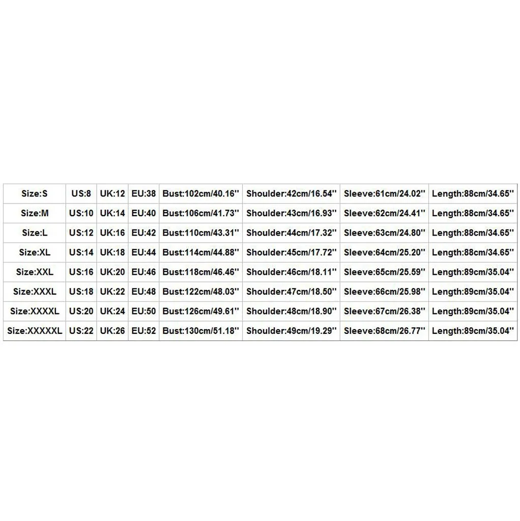 | Размеры: XXXL | Свяжитесь с нами: 18 | Великобритания: 22 | ЕС: 48 | Бюст: 122 см/48,03 дюйма | Плечо: 47 см/18,50 дюйма | Рукав: 66 см/25,98 дюйма | Длина: 89 см/35,04 дюйма |