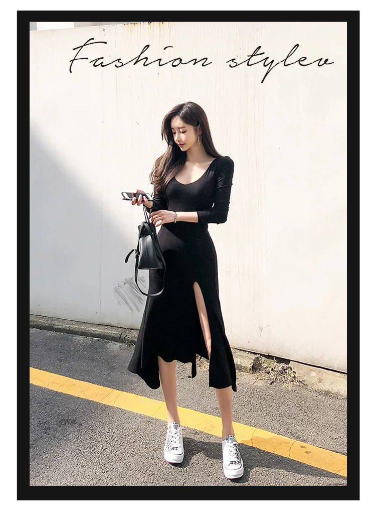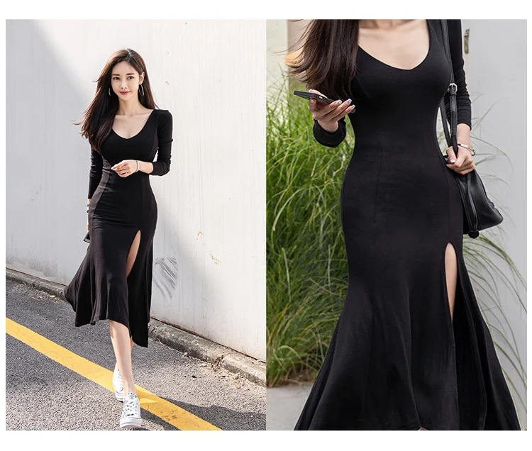 Женское длинное платье-макси CINESSD, черное платье с длинным рукавом и круглым вырезом, разрез до талии, Свободные Повседневные Вечерние платья размера плюс