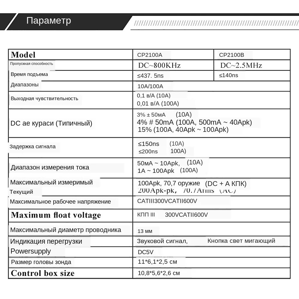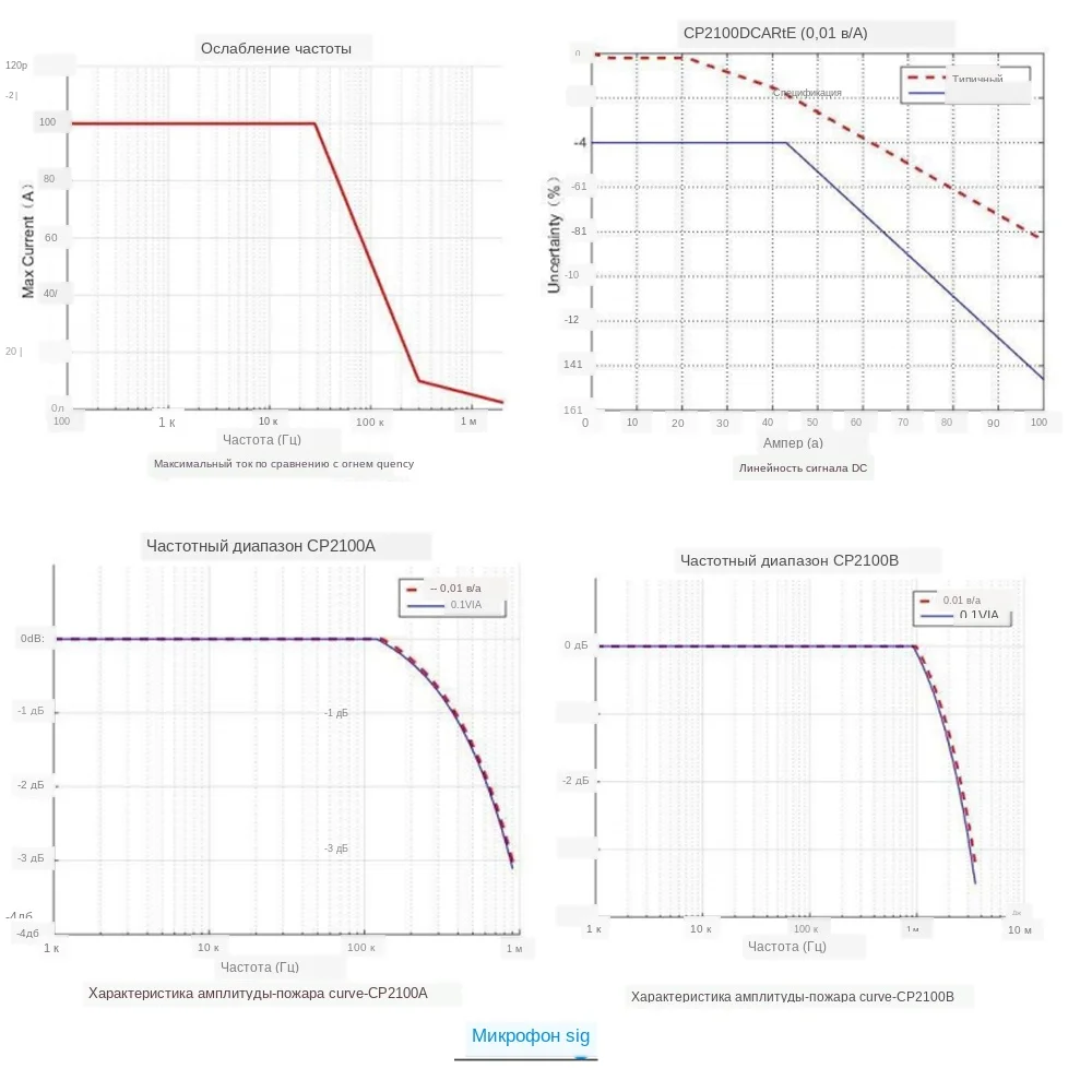 Меры предосторожности 1. Измерительная цепь должна быть CAT II 600 в или ниже.? Не измеряйте Голый Проводник. 2. Не прикасайтесь к проводнику под тестом и головке датчика во время Измерения. 3. Не использовать во влажных/влажных условиях. 4. Не прикасайтесь к прибору или объекту, подвергаемому испытанию, мокрыми руками. 5. Пожалуйста, используйте этот продукт в пределах, разрешенных терминалом. 6. Пожалуйста, используйте этот продукт по мере необходимости.? Пожалуйста, заземлите продукт через USB кабель питания. Технические характеристики Версия: 1,0 Изменение содержания: первый выпуск Время выпуска: 2019,05 Параметры: CP2100A/CP2100B Полоса пропускания: DC ~ 800 кГц (CP2100A)/DC ~ 2,5 МГц (CP2100B) Время подъема: ≤583ns (CP2100A)/≤175ns (CP2100B) Диапазоны: 10A/100A (опционально на переключателе) Чувствительность на выходе: 0,1 в/A (10 а)/0,01 в/A (100 А) Постоянный ток (Типичный): 3% ± 50 мА (10А)/4% ± 50 мА (100А, 500мА ~ 40апк) /15% (100А, 40апк ~ 100апк) Задержка сигнала: <150ns (10A)/<200ns (100A) Линейность сигнала постоянного тока (типичная): линейность сигнала постоянного тока, типичная на странице 6 Диапазон измерения: 50 мА ~ 10 АПК (10 а)/1 А ~ 100 АПК (100 А) Максимальный измеримый ток: 100 АПК, 70,7 стрелок (DC + ACpk)/200Apk-pk, 70,7 стрелок (AC) Максимальное рабочее напряжение: CAT III 300 В CAT II 600 в Максимальное поплавковое напряжение: CAT III 300 В CAT II 600 в Максимальный диаметр проводника: 13 мм Индикация перегрузки: звуковой сигнал, мигающий светильник кнопки Источник питания: 5 В постоянного тока Размер головки зонда: 11*6,1*2,5 см Размер коробки управления: 10,8*5,6*2,6 см Длина: 228 см Вес: 290 г Вес одной посылка: 1000 г Один посылка Размер: 29,5*23,6*5,7 см Рабочая температура: 0 °C ~ 50 °C Температура хранения:-20 °C ~ 80 °C Рабочая влажность: 5% ~ 95% (0 °C ~ 40 °C, без конденсации) /5% ~ 65% (40 °C ~ 50 °C, без конденсации) Рабочая высота: ≤3000m Высота хранения: ≤12000m Инструкции: 1. Подключите BNC токового зонда к осциллографу (или другому инструменту) и подключите usb-кабель для питания токового зонда. 2. В зависимости от тока, выберите соответствующий диапазон на зонде, соответствующий кнопочный светильник становится зеленым. 3. Отрегулируйте настройки осциллографа: входное сопротивление 1 МОм; выберите ток или установите блок отображения в качестве; Установите мультипликатор затухания зонда соответствующего канала. Если зонд 100А (0,01 в/А), осциллограф должен быть 100х, если зонд 10А (0,1 в/А), осциллограф 10х. 4. Нажмите кнопку auto zero, чтобы осуществить автоматическую нулевую регулировку Зонд. После того, как нулевая Регулировка будет успешно выполнена, звуковой сигнал на один раз. В противном случае «Звуковой сигнал» будет 3, что означает, что нулевая Регулировка не работает; Внешнее магнитное поле может слегка повлиять на ноль постоянного тока зонда. После того, как нулевая Регулировка завершена, пожалуйста, не перемещайте ее в большом диапазоне. 5. Откройте зажим токового зонда для зажима проводника под испытанием в соответствии с направлением, указанным зажимной головкой. Примечание: Если измеренное направление потока тока находится в противоположном направлении, указанном зажимной головкой, выход является отрицательным. 6. Отрегулируйте осциллограф, чтобы получить лучшую форму волны. Примечание: Когда ток превышает диапазон, зуммер будет звучать в течение длительного времени, и кнопочный светильник будет мигать. Техническое обслуживание 1. В течение гарантийного срока продукта и при нормальном использо