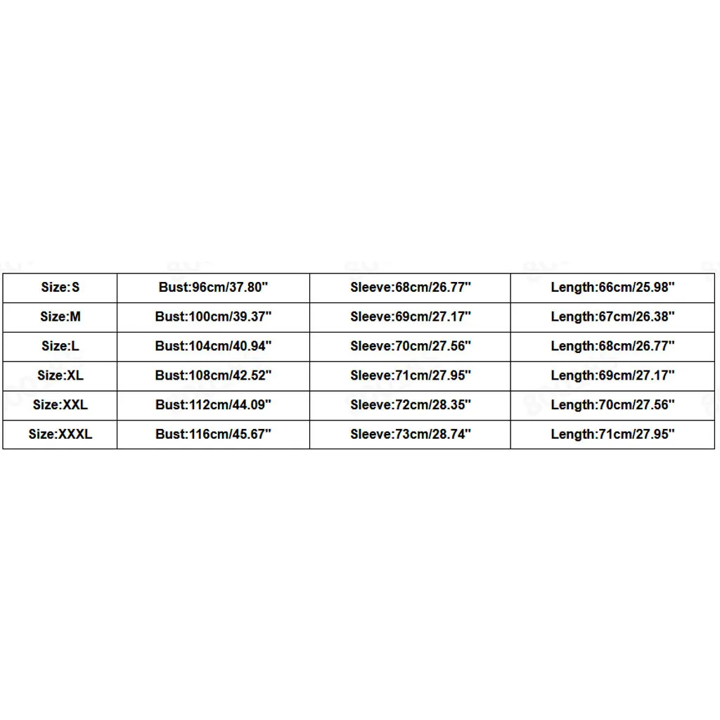 | Размеры: XXXL | Обхват груди: 116 см/45,67 дюйма | Рукав: 73 см/28,74 дюйма | Длина: 71 см/27,95 дюйма |