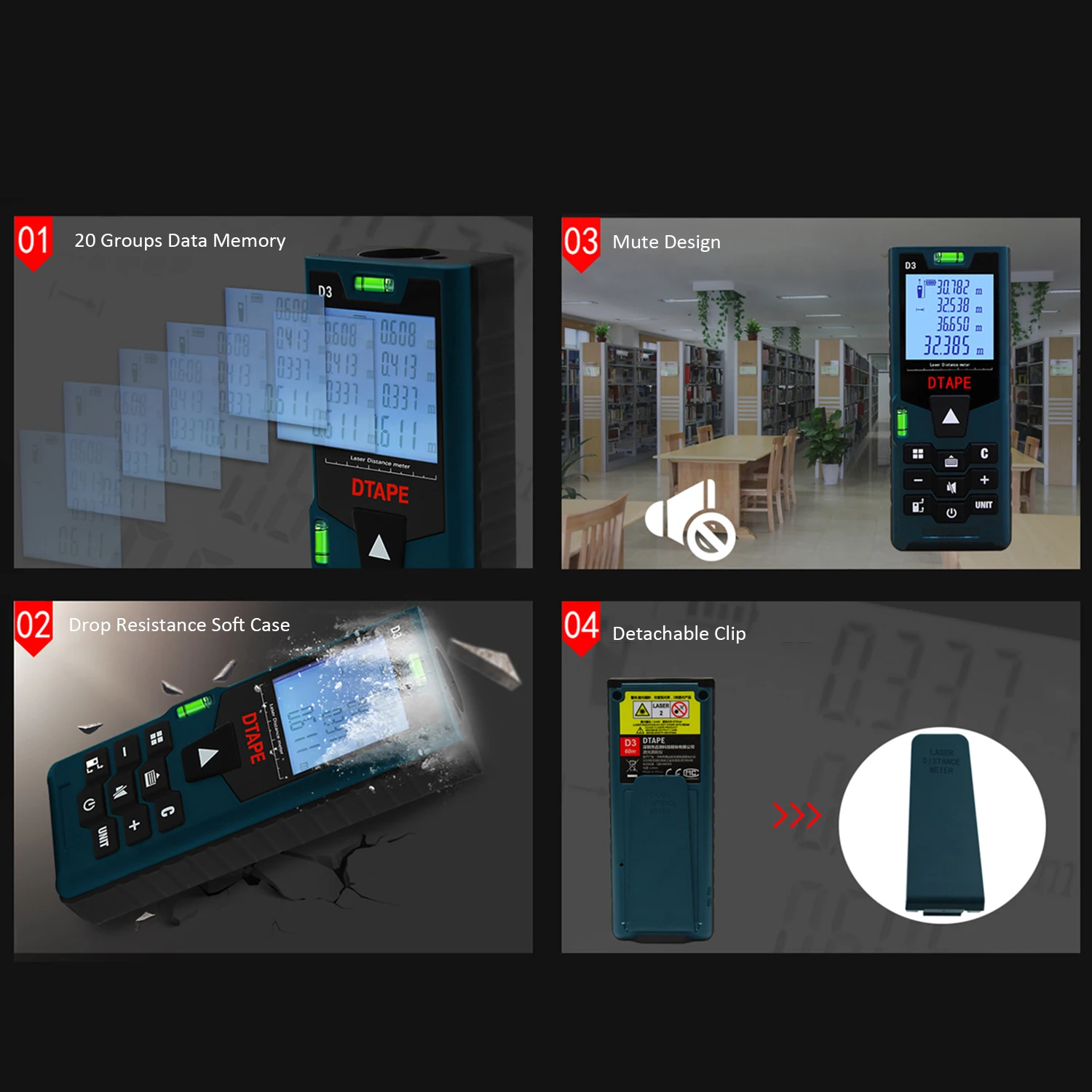 Различные настройки: 20 групп памяти, 3 единицы измерения: m/in/ft, индикатор buzzer, сложение и вычитание, автоматическое отключение без работы 180s.