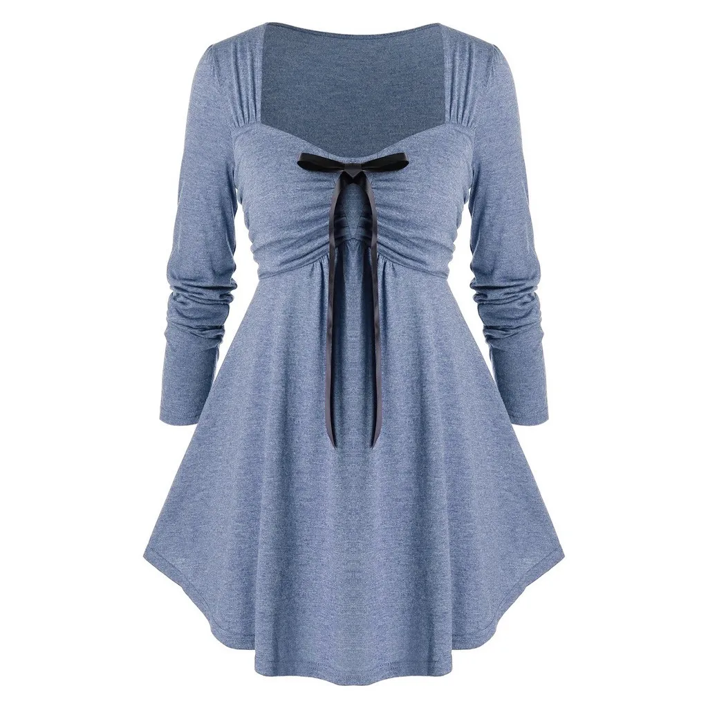 Женщины плюс размер сплошной цвет квадратный воротник Лук Высокая талия плиссированный длинный рукав Топ