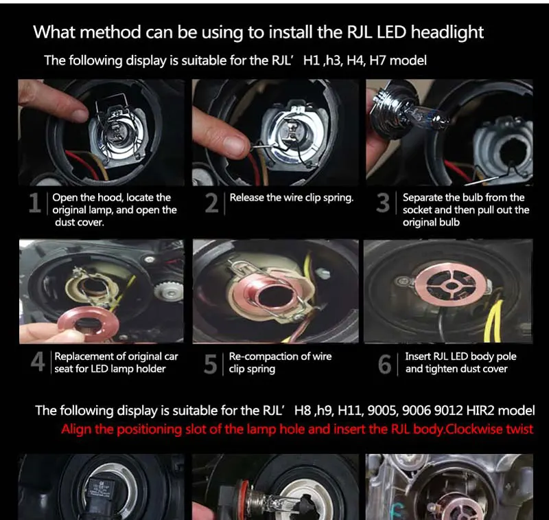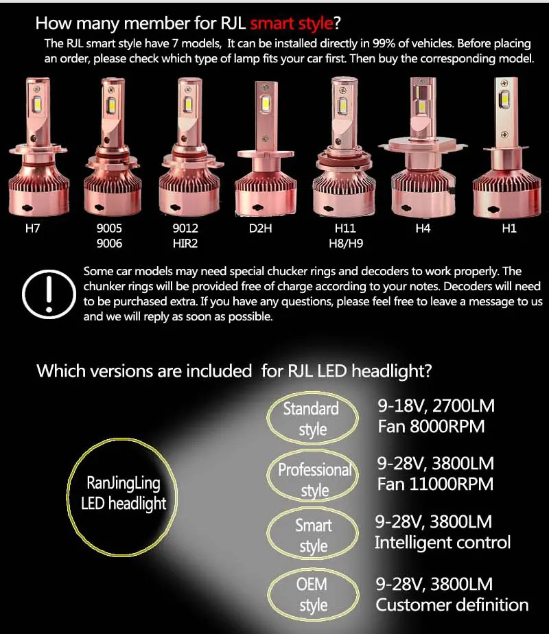 Hhe RJL Smart Style имеет 7 моделей, они могут быть установлены непосредственно в 99% транспортных средств. Перед размещением заказа, пожалуйста, проверьте, какой тип лампы подходит для вашего автомобиля, а затем купите соответствующую модель.