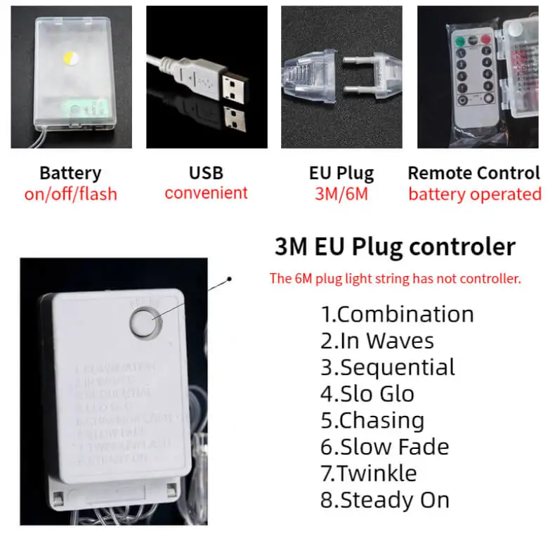 1. Батарея:Положите батарейки типа АА в батарейный отсек, и светильник будет светильник или похода по магазинам. Есть три режима: горит постоянно, вспышка, ВЫКЛ. 2.USB:Применяется для бытовых приборов с USB-разъемом, зарядным устройством, ноутбуком. 3. Штепсельная Вилка европейского стандарта: может быть подключена к источнику питания 220 В. Два штекера светильник строки может быть подключен туда и обратно для хорошей декорации. Светильник вая лента с разъемом 3 м и простым контроллером может переключаться между режимами: постоянное включение, медленное выцветание, волны и т. д. Светильник вая лента с разъемом 6 м не имеет контроллера: штекер подключен к источнику питания 220 В, светильник. 4. Дистанционное управление: светильник вая лента с дистанционным управлением работает от батарейки, она может регулировать яркость и выбрать режимы светильник: комбинация, в волнах, последовательно, slo glo, в ГОНЕ, медленное выцветание, мерцание, постоянно включается, выключается.Нужно знать: