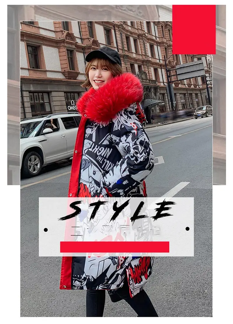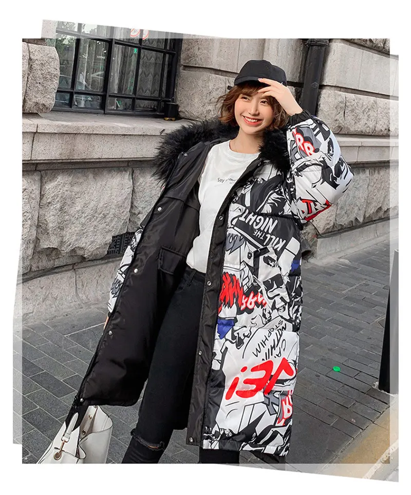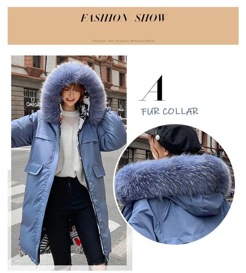 Женская зимняя куртка с меховым капюшоном, длинная парка, Реверсивный свободного кроя с принтом пальто куртка-пуховик на хлопковой подкладке верхняя одежда для детей возрастом от 2 Двусторонняя одежда теплая куртка-пальто