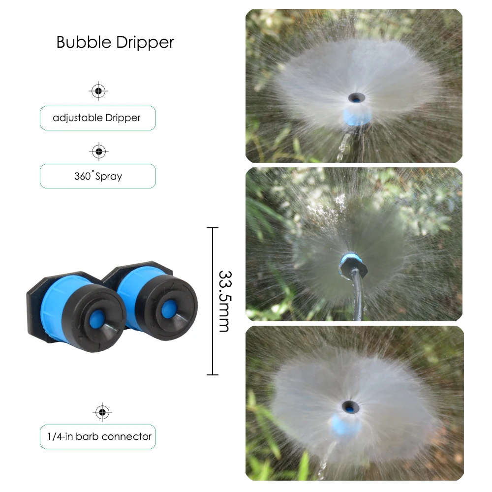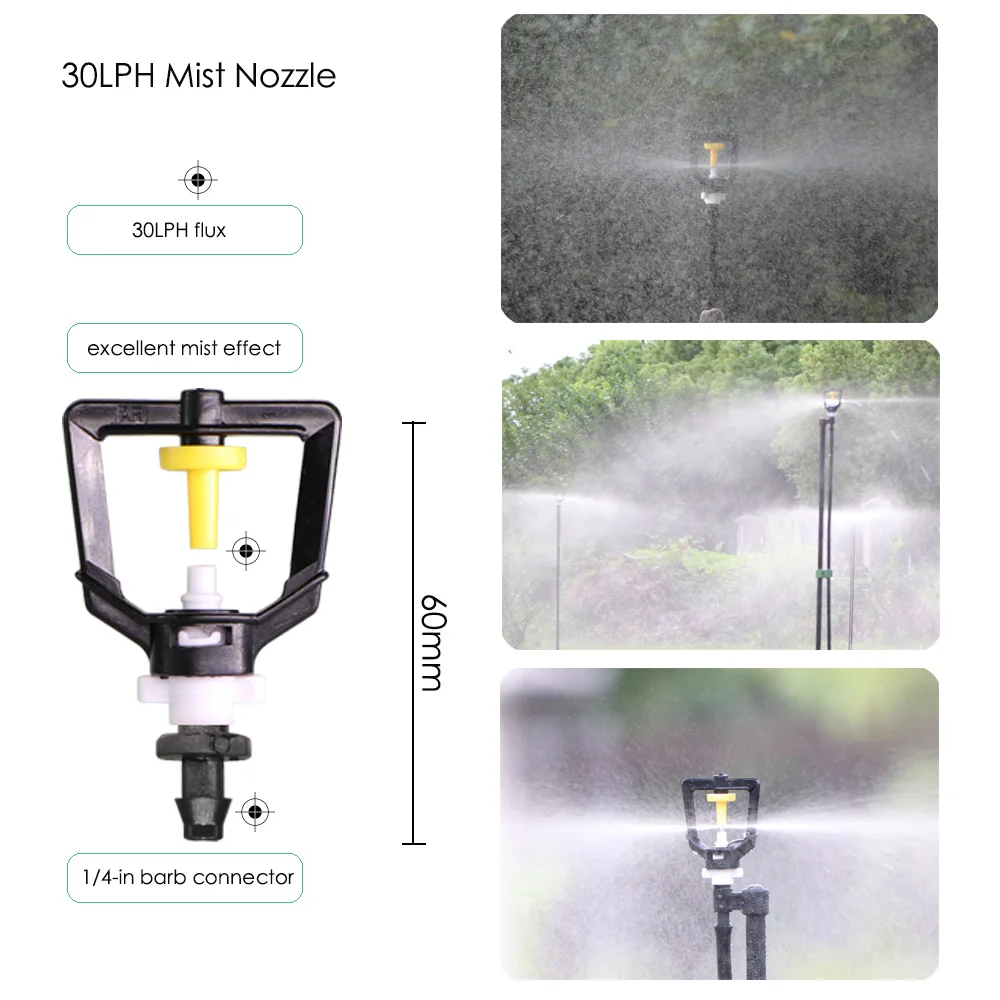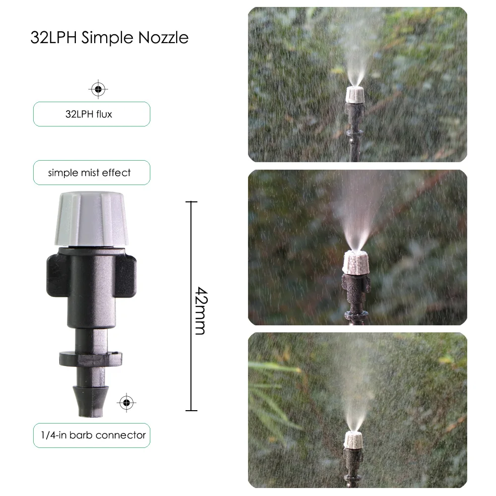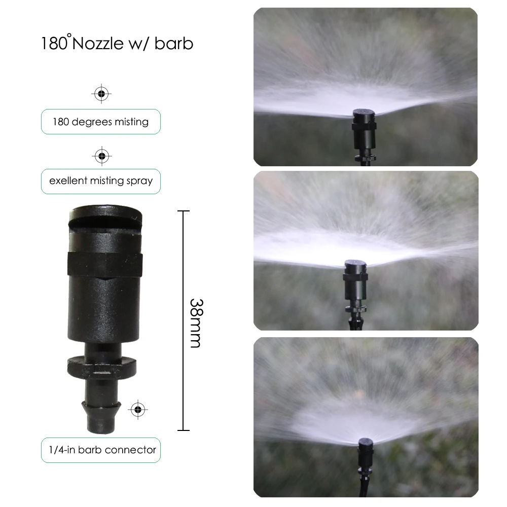 -Он включает в себя 10 типов сопла или спринклеров. Включая регулируемое сопло с 8 отверстиями, 30LPH распылитель тумана, простое сопло тумана, 180 градусов сопло тумана, 4L капельница, 8L капельница, 360 градусов пузырьковая насадка, регулируемый латунный патрубок, 4/7 мм локоть со стрелками, 180 градусов черный nozle.