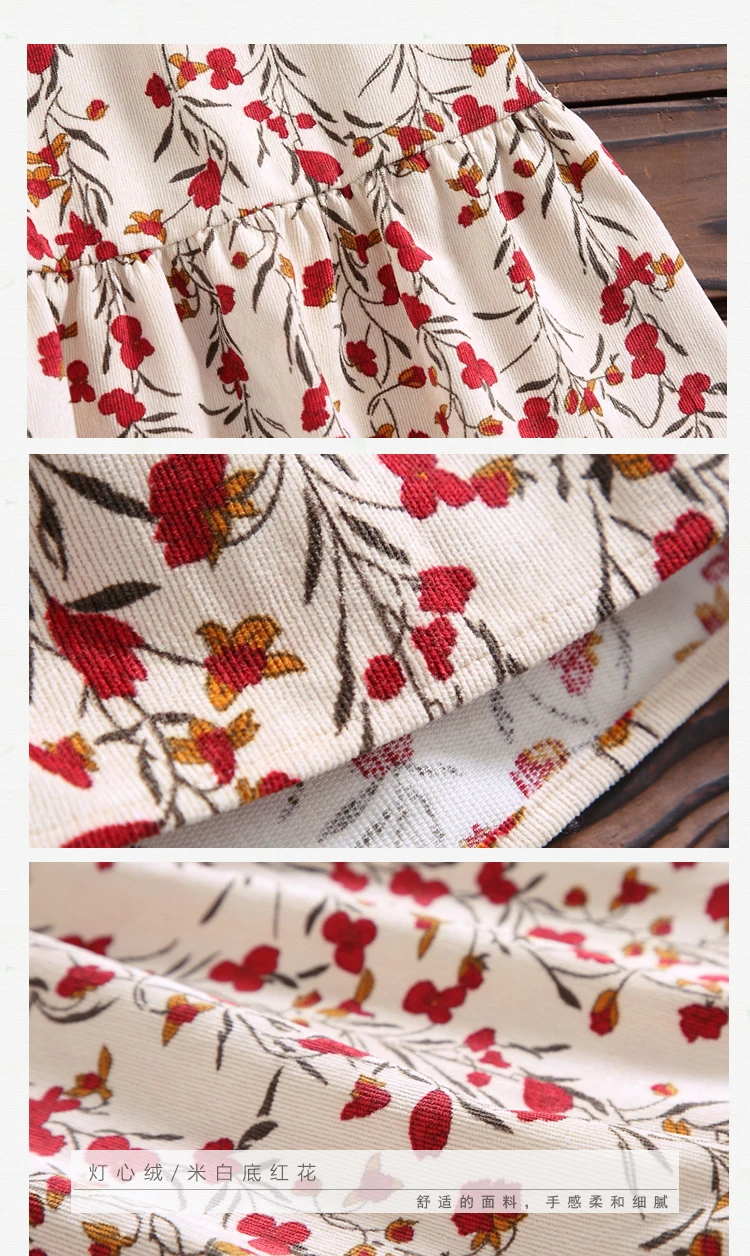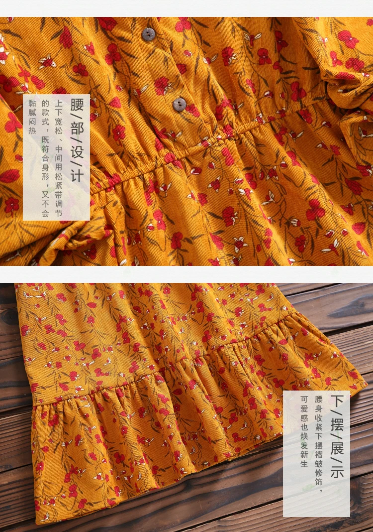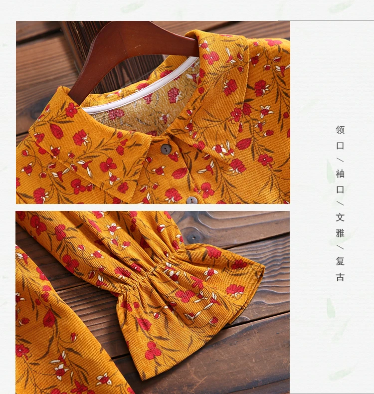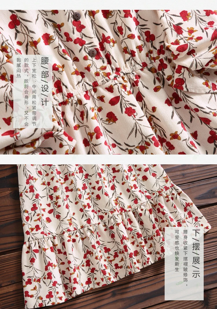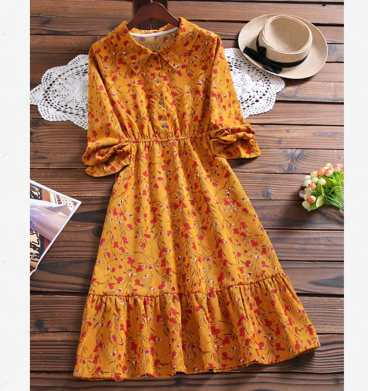 Новое поступление, женское милое вельветовое платье средней длины, Осеннее модное Повседневное платье с длинным рукавом и цветочным принтом, mori girl vestidos