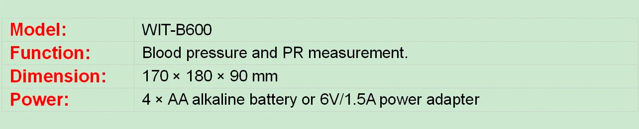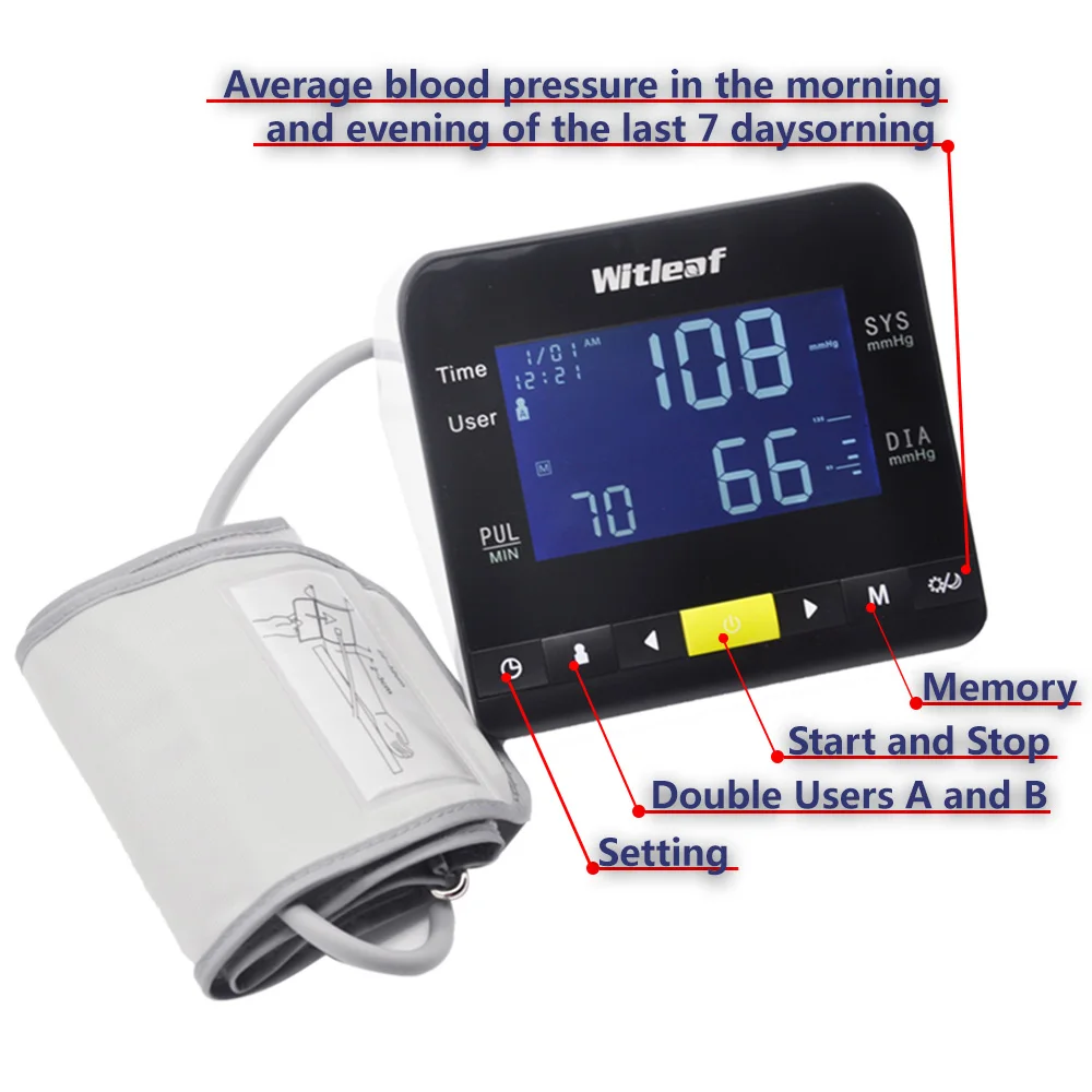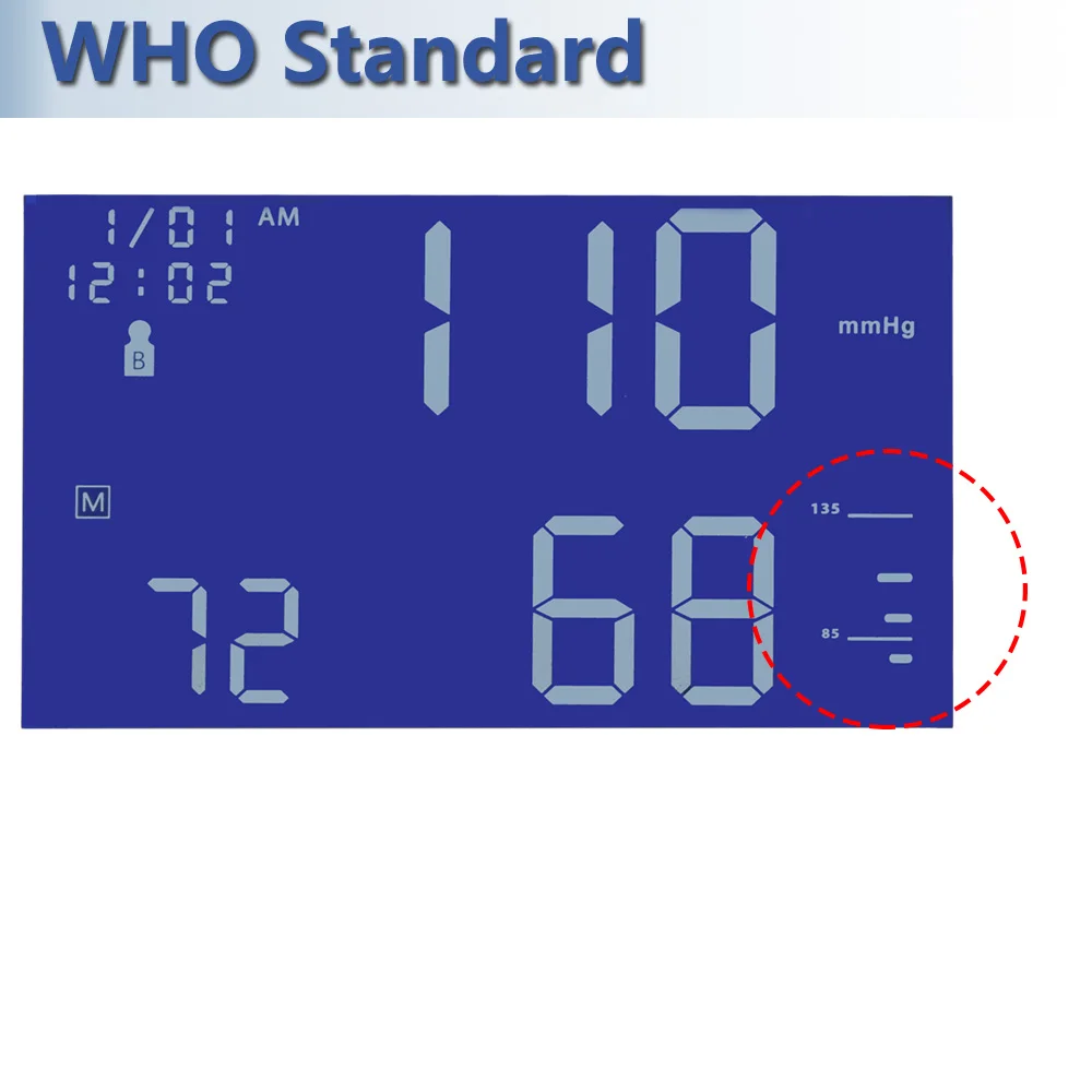 1,5-дюймовый большой ЖК-экран, легко читаемый с четким дисплеем 2. Выбор единицы: кПа и мм рт. Ст. Выбираются. 3. Один ключ триггера, простой, надежный и простой в использовании 4. Интегрированный дизайн с кабиной для хранения 5. Утреннее и ночное среднее значение отображения последних 7 дней, что полезно для утреннего скачка артериального давления 6. Двойной режим пользователей, который может быть переключен быстро, 90 групп хранения данных для каждого пользователя 7. Поддерживает режим измерения гостя, управление семейными данными не будет смешиваться 8. Среднее значение отображения последних 3 результатов 9. Отображение уровня кровяного давления ВОЗ, интеллектуальная Оценка высокого кровяного давления 10. Сигнализация высокого давления, низкого давления и аномального PR. 11. Сигнал о низком заряде батареи: Когда напряжение в d.c. (5 ± 0,5) в, символ, указывающий низкую электрическую энергию. 12. Настройка времени и даты: Время, дата может быть установлен и год может быть установлен. Время применяется система 12 часов. 13. Энергосберегающий дизайн, Автоматическое отключение через 1 минуту, любой ключ для пробуждения