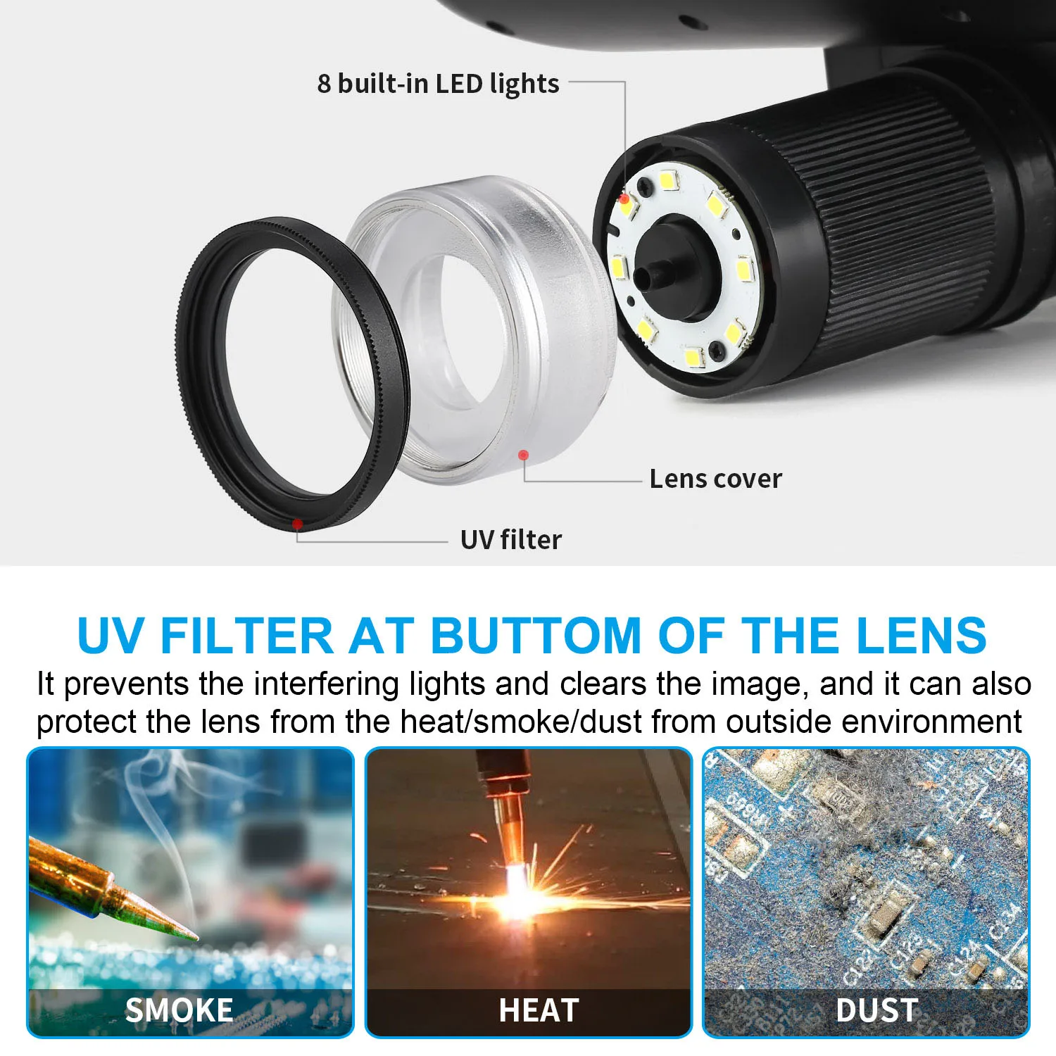 Светодиодный светильник: Встроенный микроскоп с 8 светодиодный светильник s и 2 гибкими вспомогательными лампами, чтобы светильник четко освещал область наблюдения или объект.