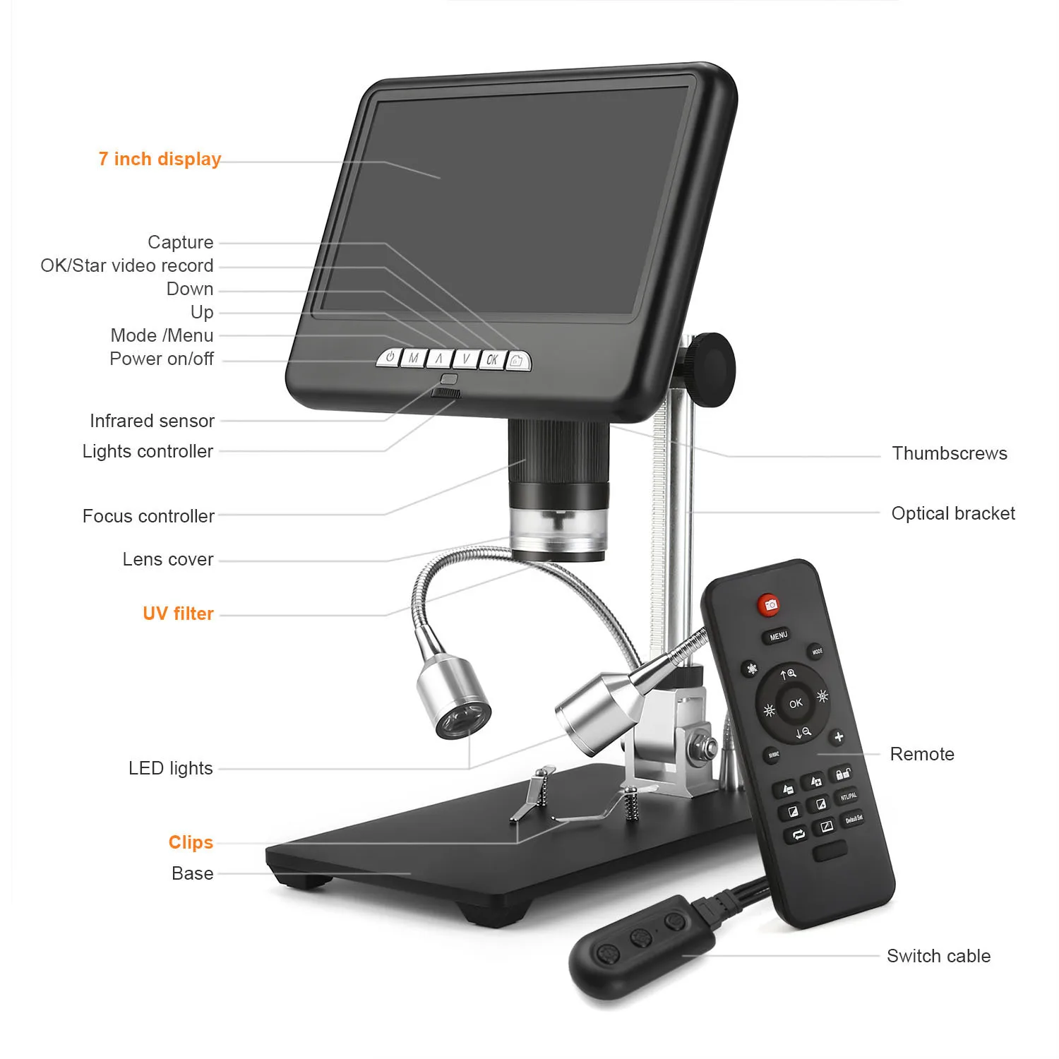 Функция записи видео и камеры: вы можете записывать видео и снимать фотографии, когда карта памяти (не входит в комплект) вставлена, и просматривать их на микроскопе или импортировать на компьютер или другие устройства.