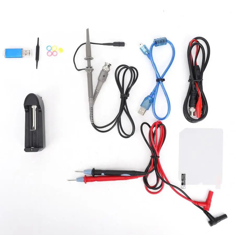 1 x осциллограф (батарея не входит в комплект) 1 x зонд 1 x линия источника сигнала 1 пара тестового свинца 1 х мини USB кабель для передачи данных Руководство пользователя на английском языке-1 шт. 1 х U диск 1 x Батарея Зарядное устройство Набор для калибровки зонда-1 шт. (инструмент для регулировки зонда-1 шт., крышка IC-1 шт., кольцо-4 шт.) 1 x Объектив пленка