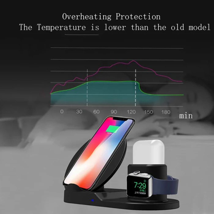 5. Беспроводное зарядное устройство 3 в 1 оснащено передовым контролем температуры, защитой от перенапряжения и перезарядки и стабильным непрерывным током, что обеспечивает безопасность зарядки ваших устройств.