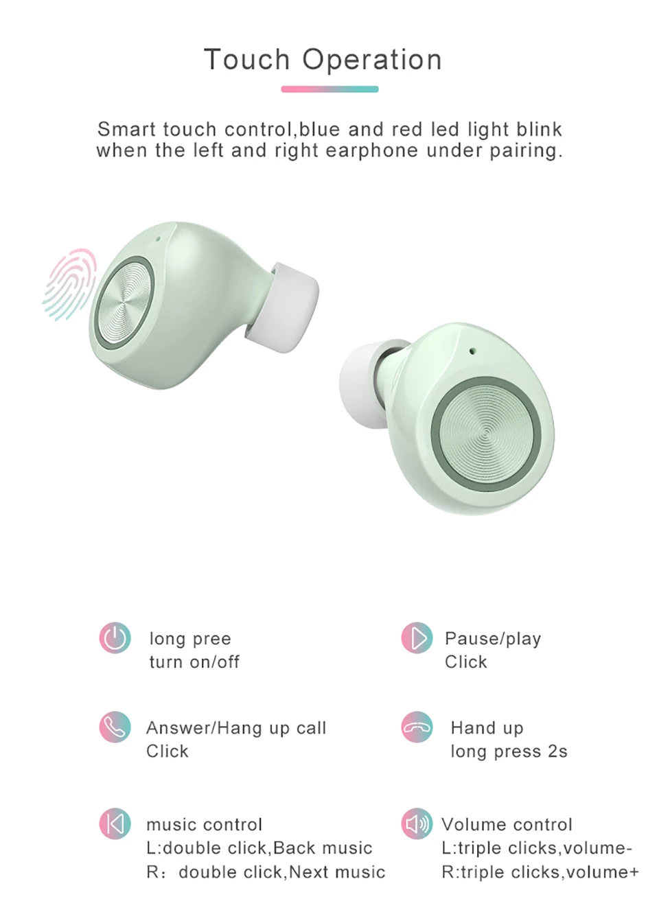 Интеллектуальное сенсорное управление, синий и красный светодиодсветильник индикаторы мигают, когда левый и правый наушники под сопряжением