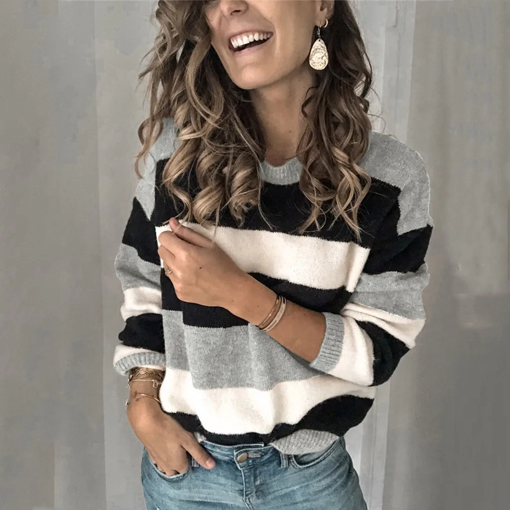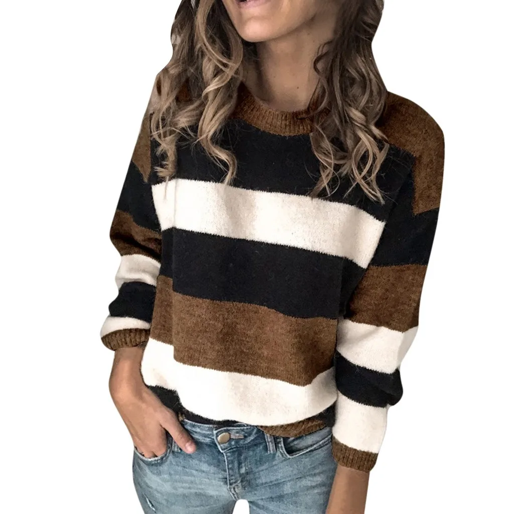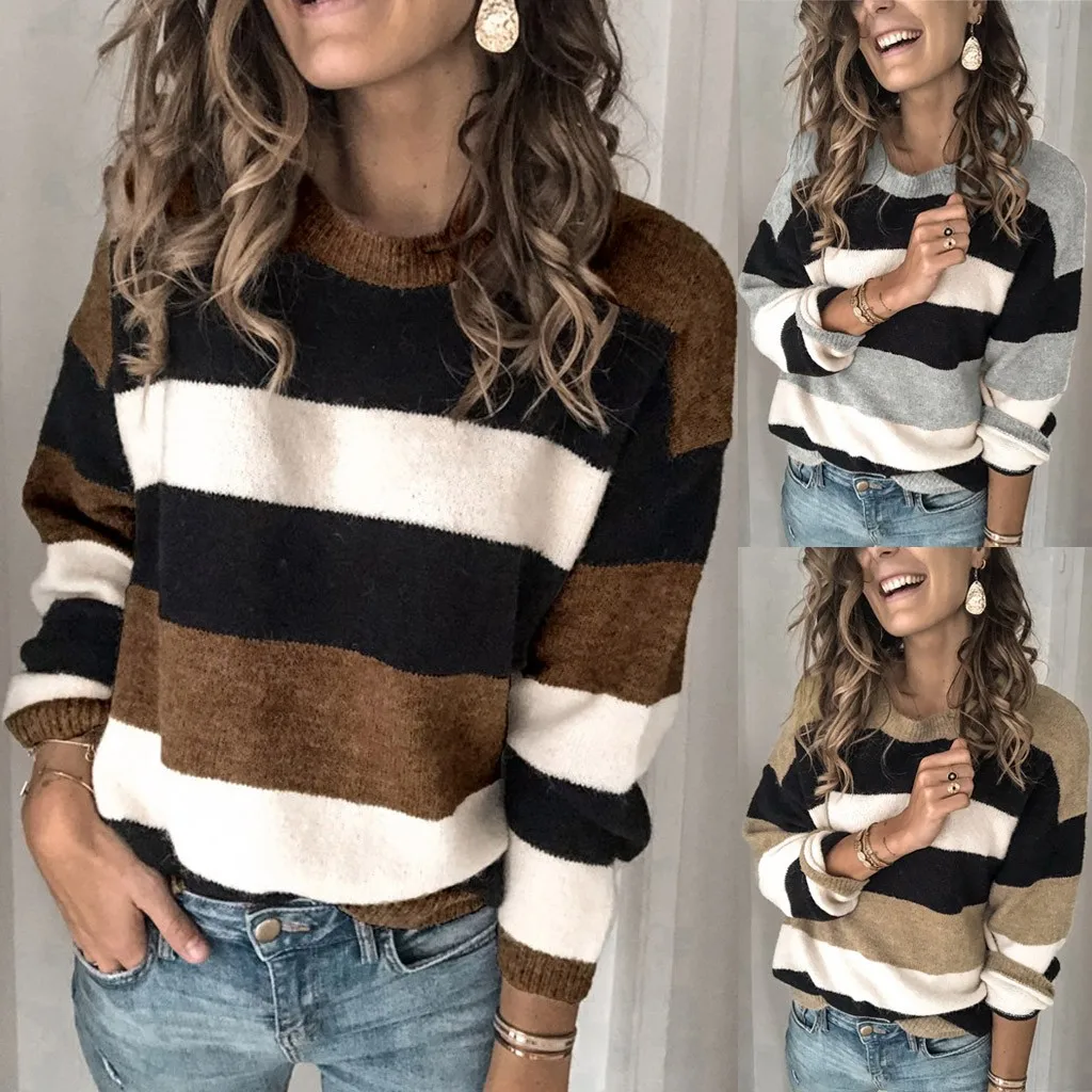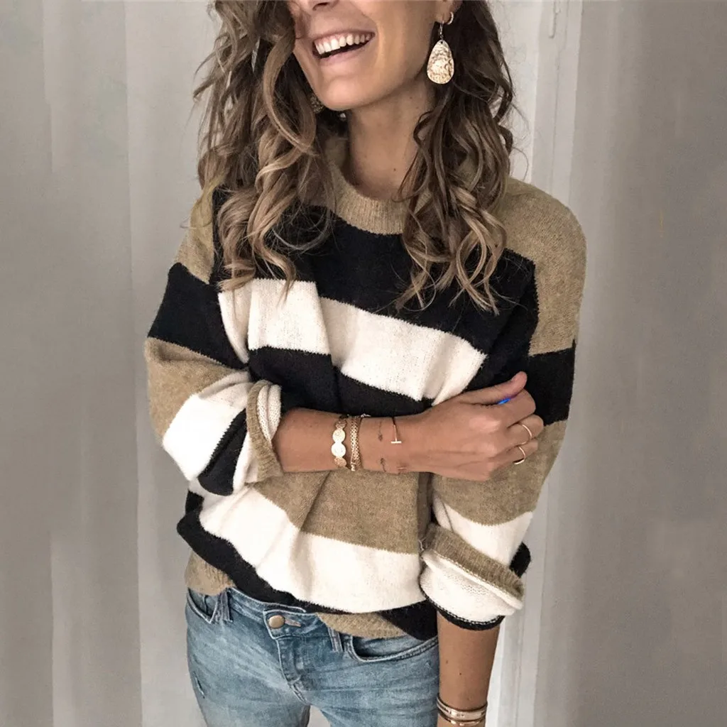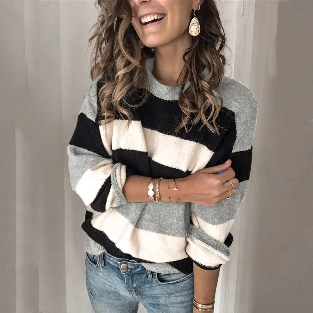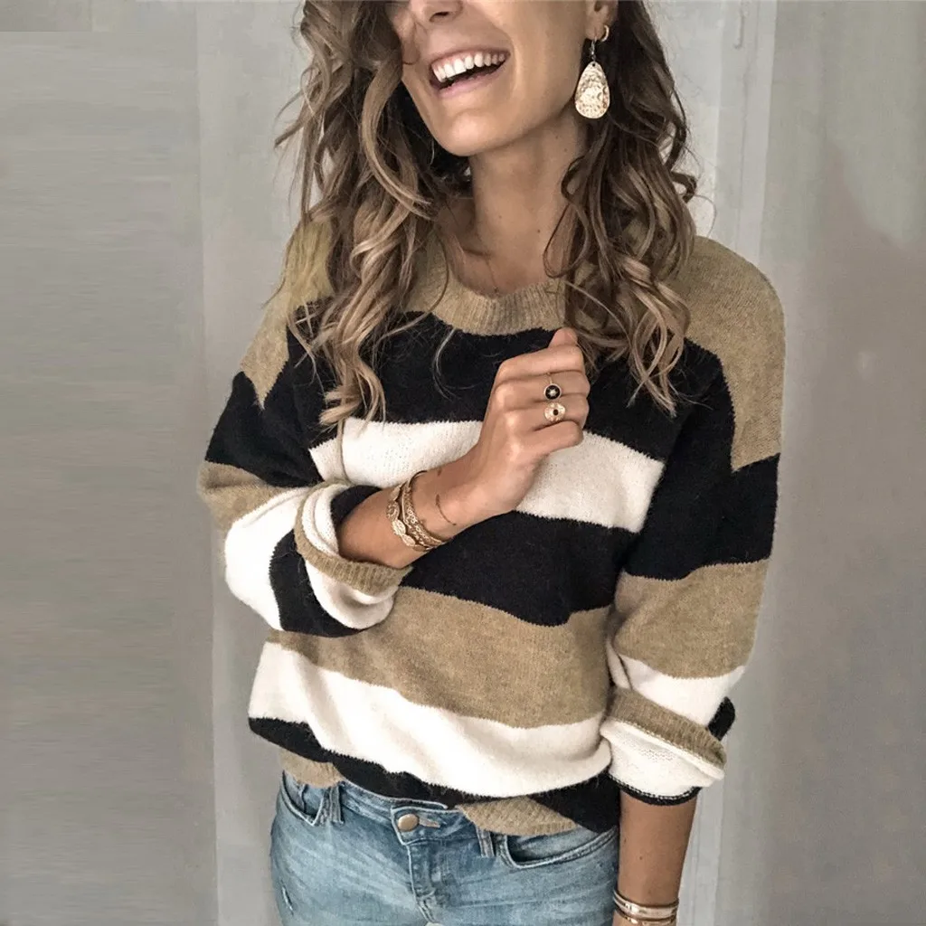 Мода женщин o-образным вырезом с длинным рукавом полосатый принт Повседневный вязаный свободный свитер Топ