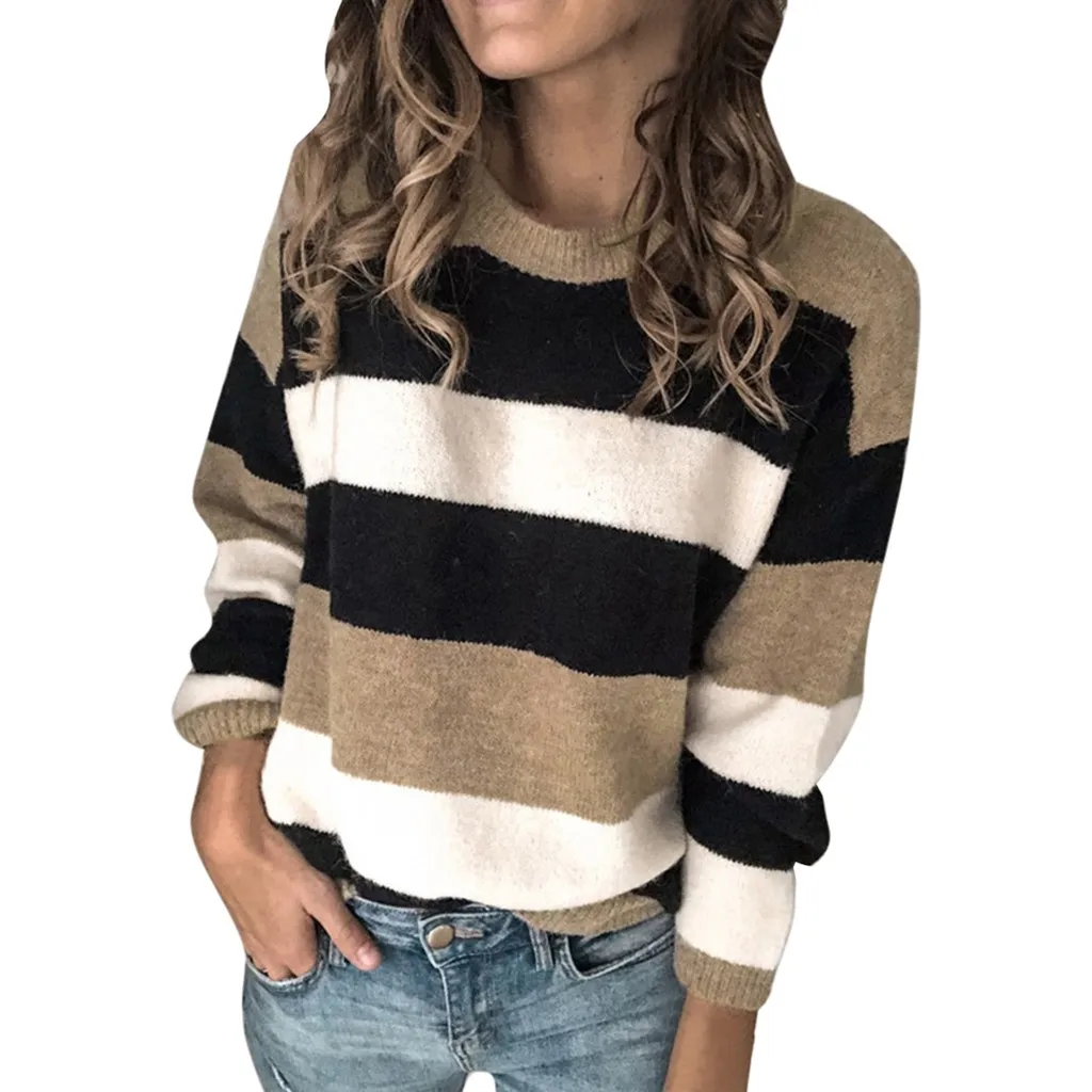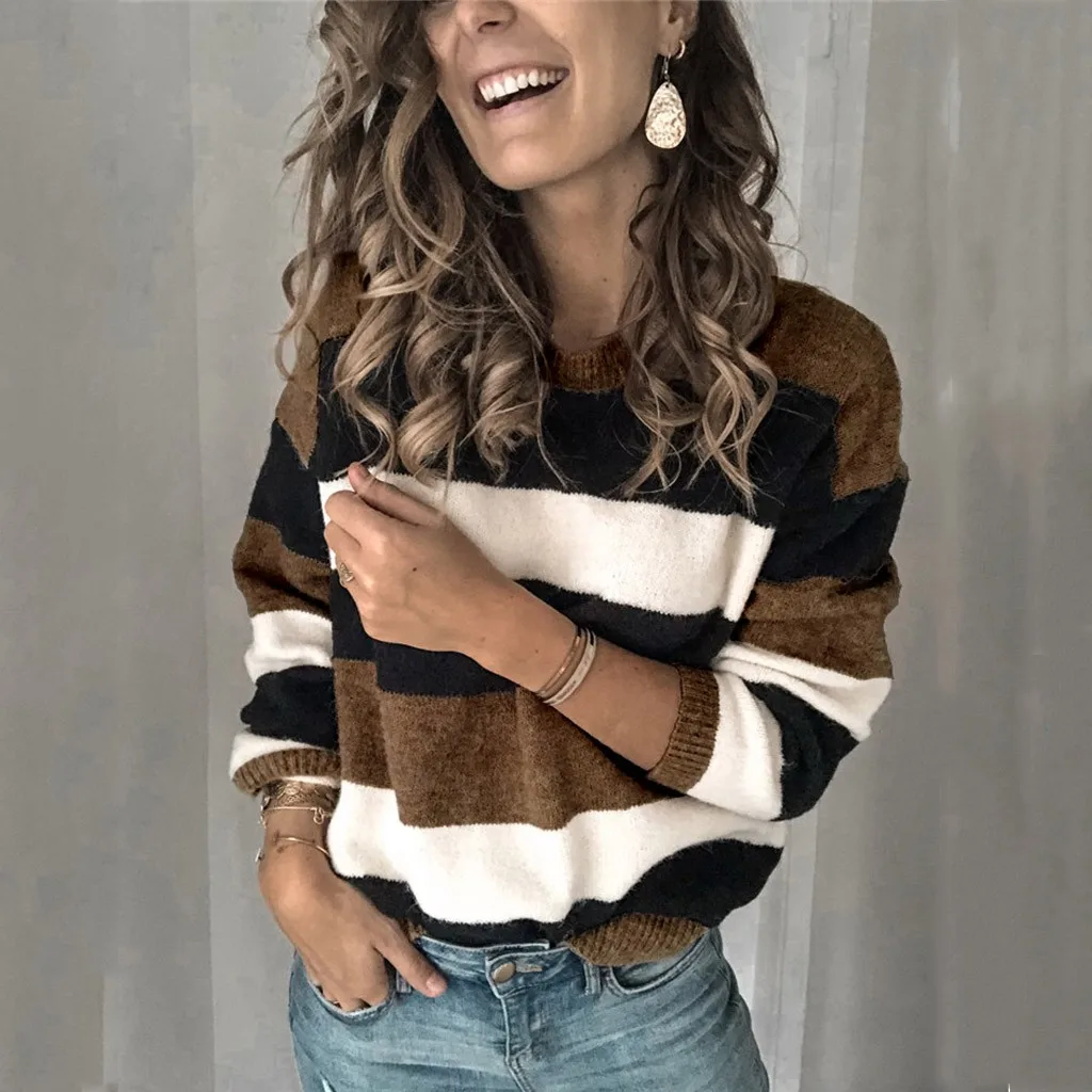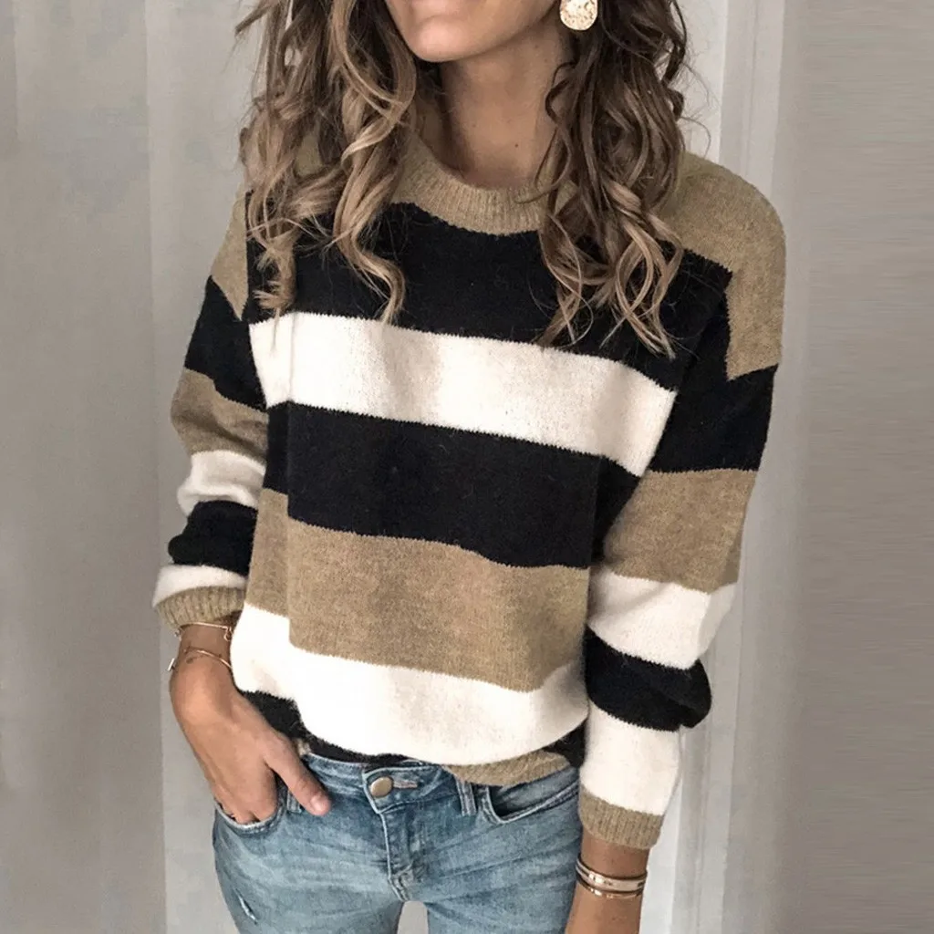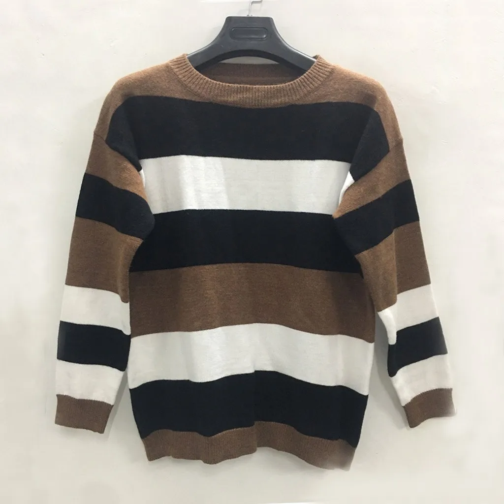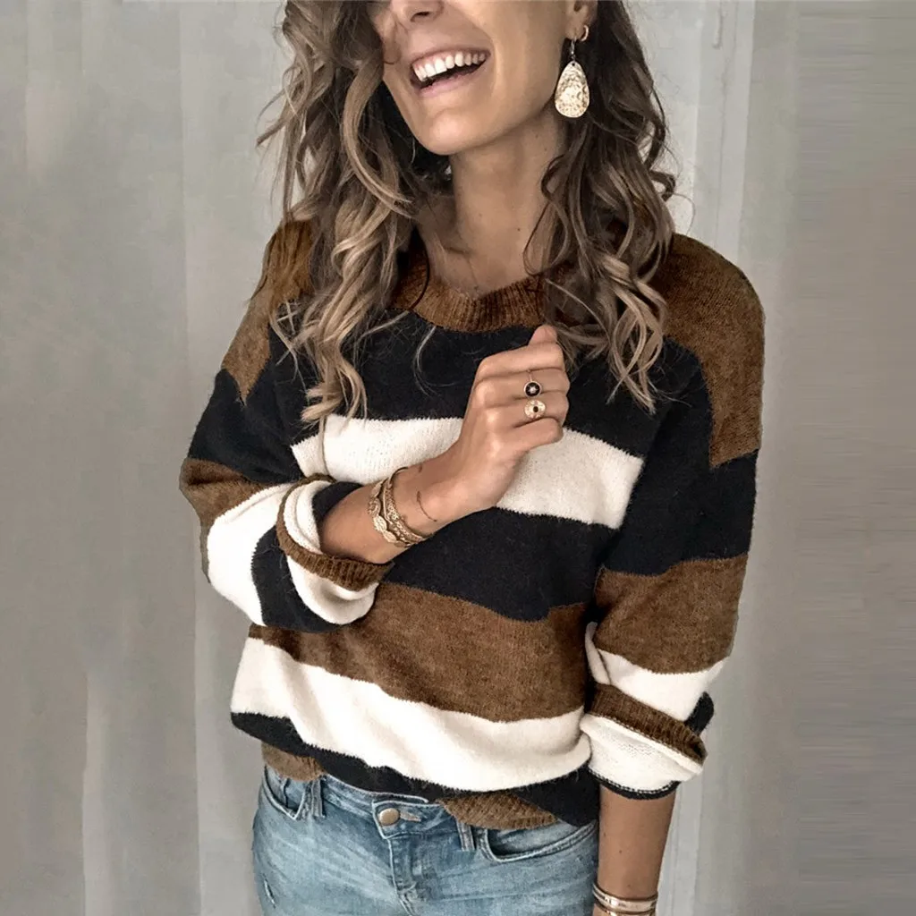 Мода женщин o-образным вырезом с длинным рукавом полосатый принт Повседневный вязаный свободный свитер Топ