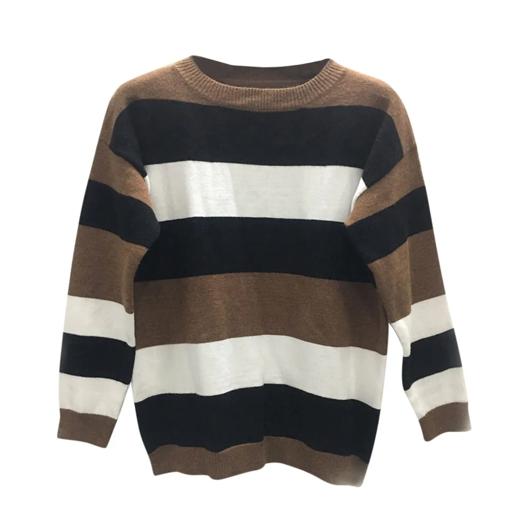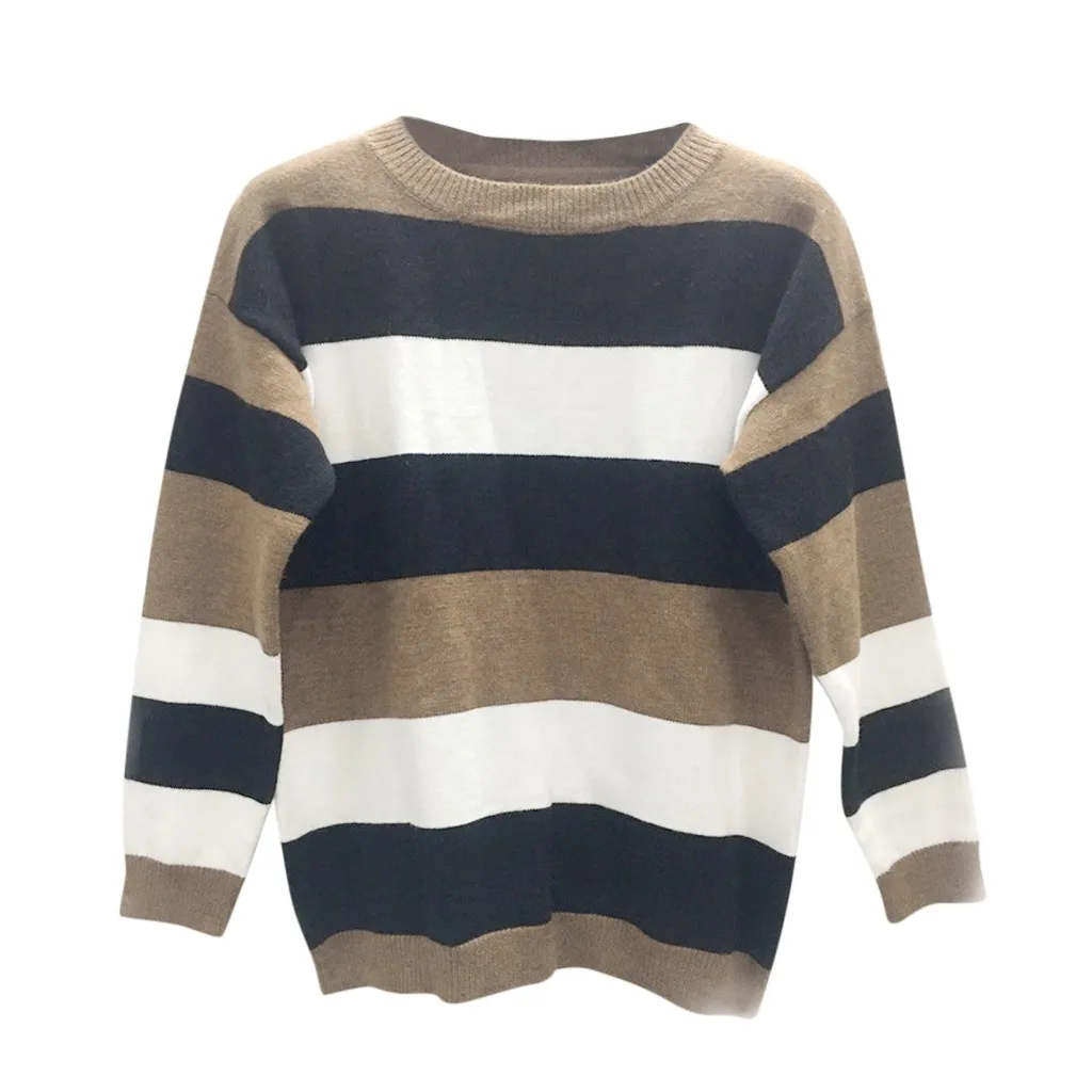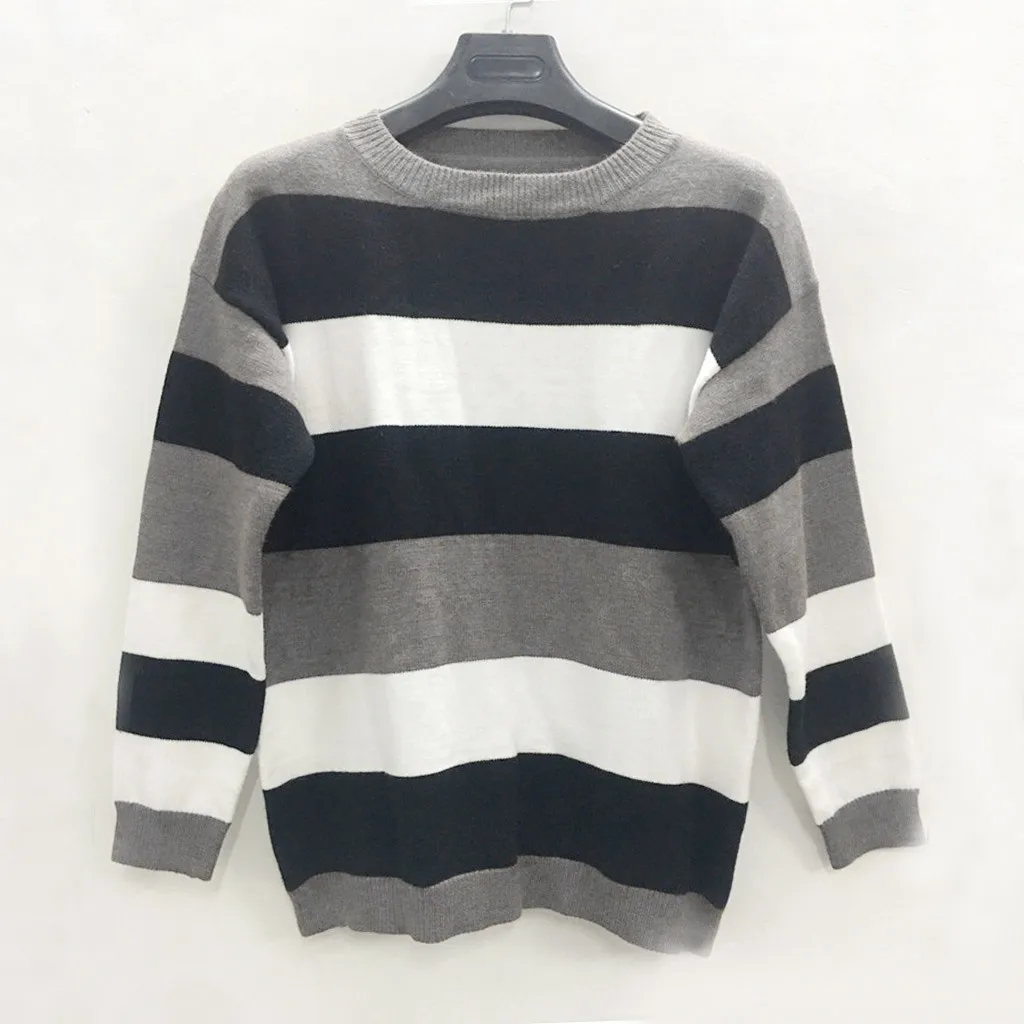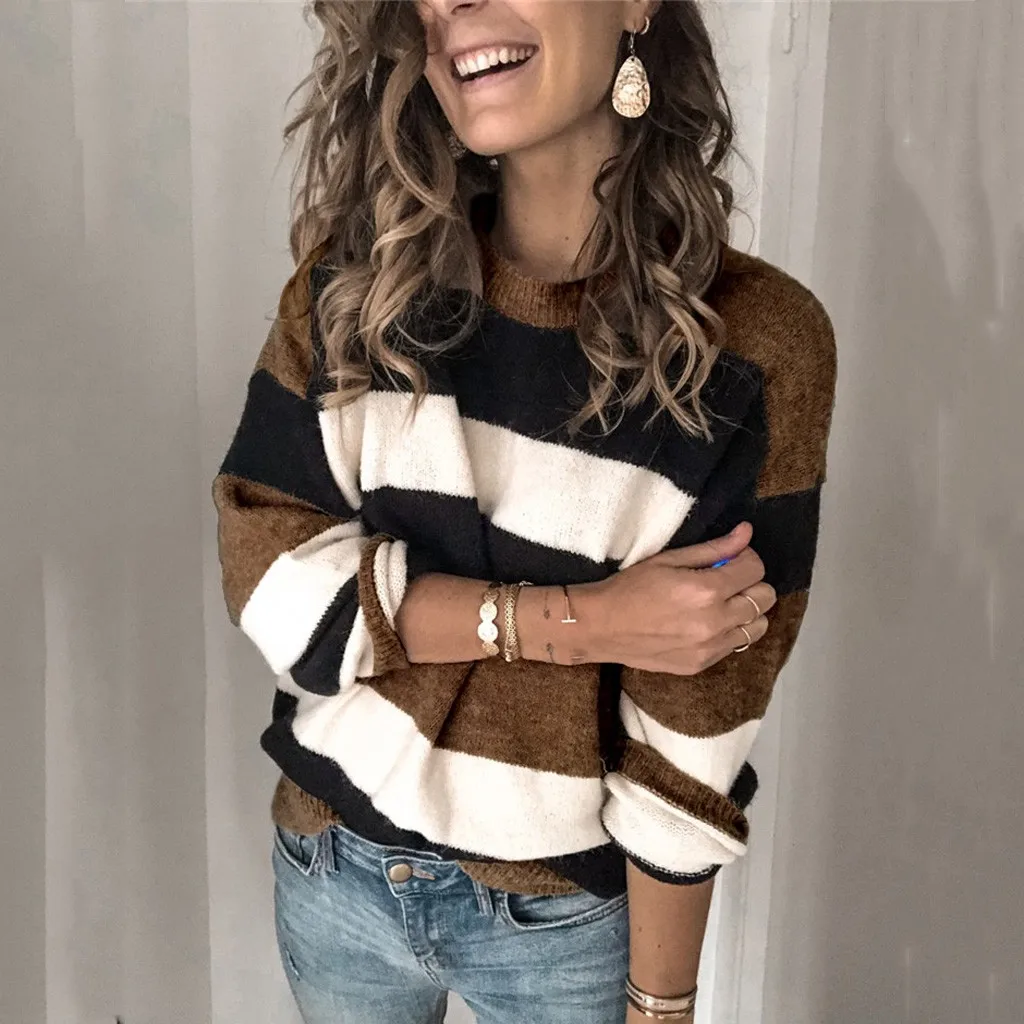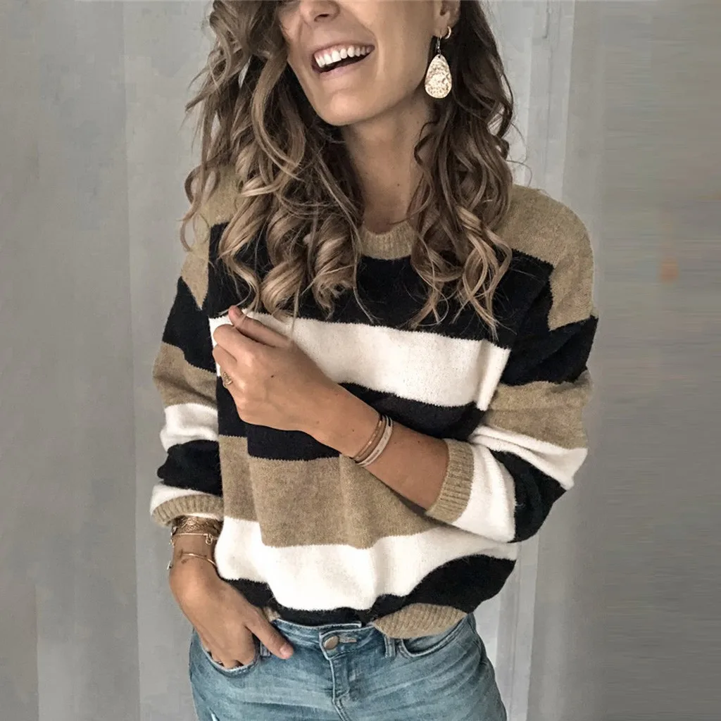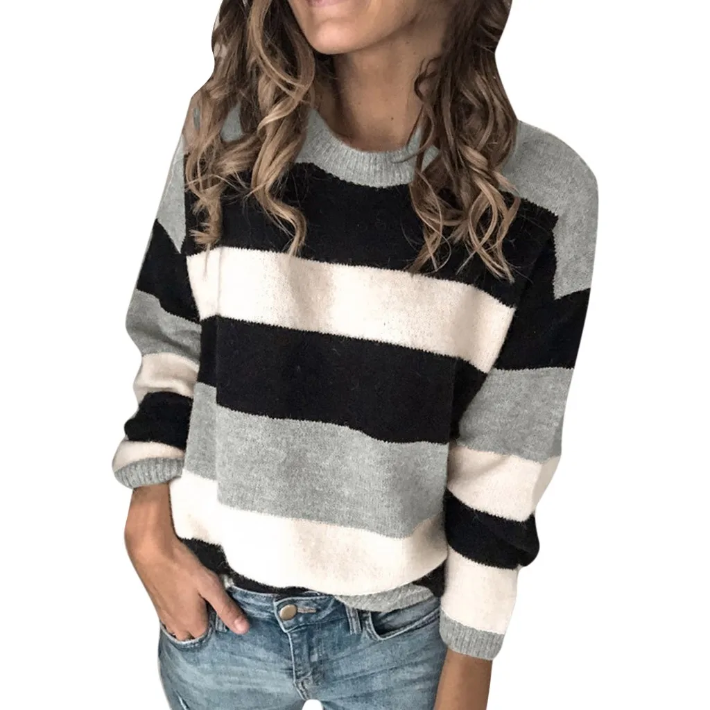 Мода женщин o-образным вырезом с длинным рукавом полосатый принт Повседневный вязаный свободный свитер Топ