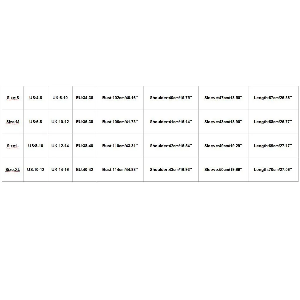 | Размеры: S | США: 4-6 | Великобритания: 8-10 | ЕС: 34-36 | Бюст: 102 см/40,16 дюйма | Плечо: 40 см/15,75 дюйма | Рукав: 47 см/18,50 дюйма | Длина: 67 см/26,38 дюйма |