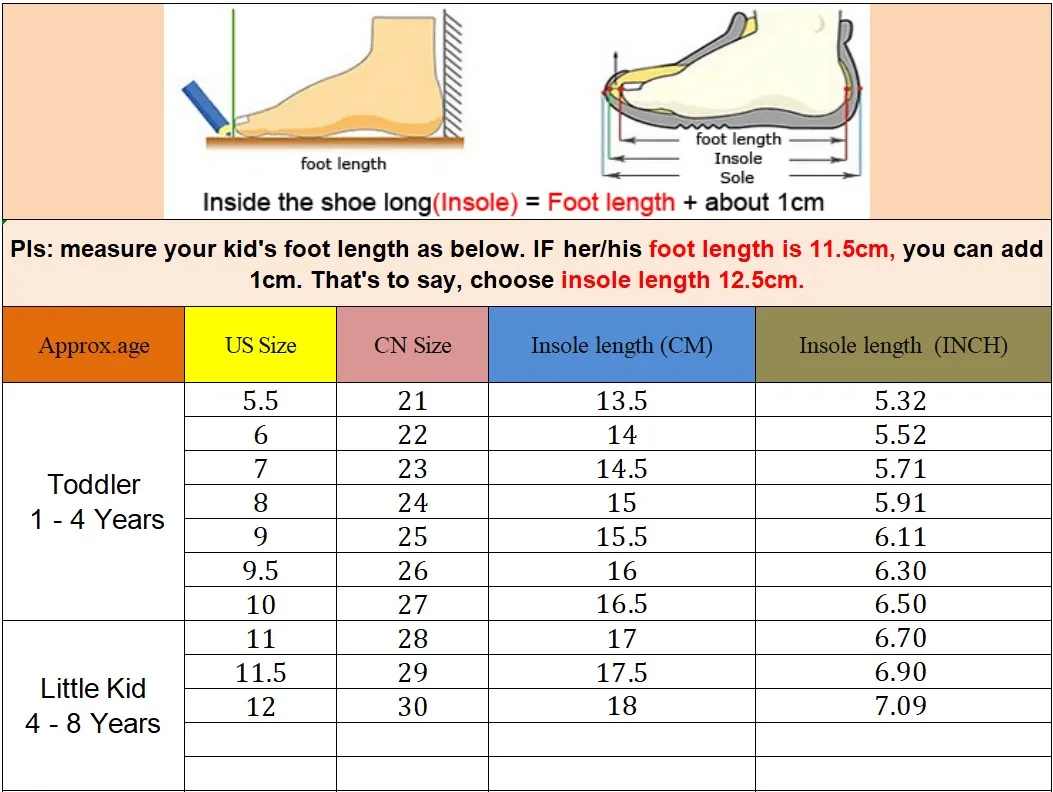 2. Что касается размера, Измерьте длину стопы ребенка в см или дюймах + 1 см или 0,03937 дюймаChВыберите соответствующий американский размер, спасибо.