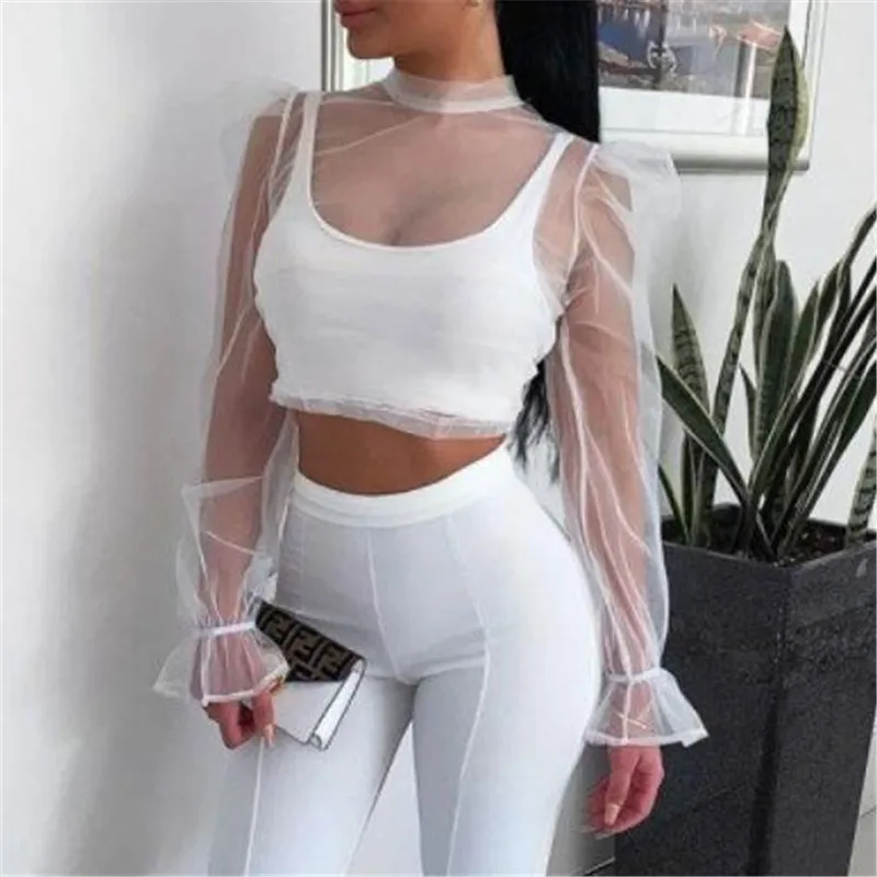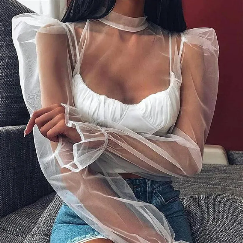 Женские прозрачные блузки, новые модные, прозрачные, сетчатые топы с длинными рукавами-фонариками, женские Короткие повседневные рубашки, осенние женские пуловеры!