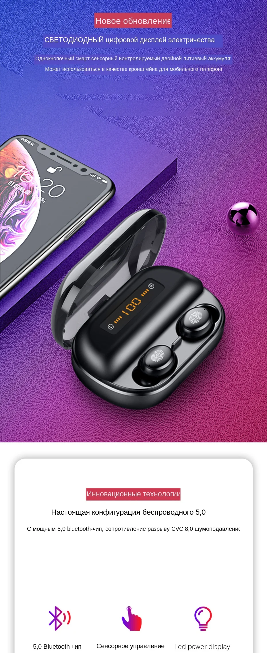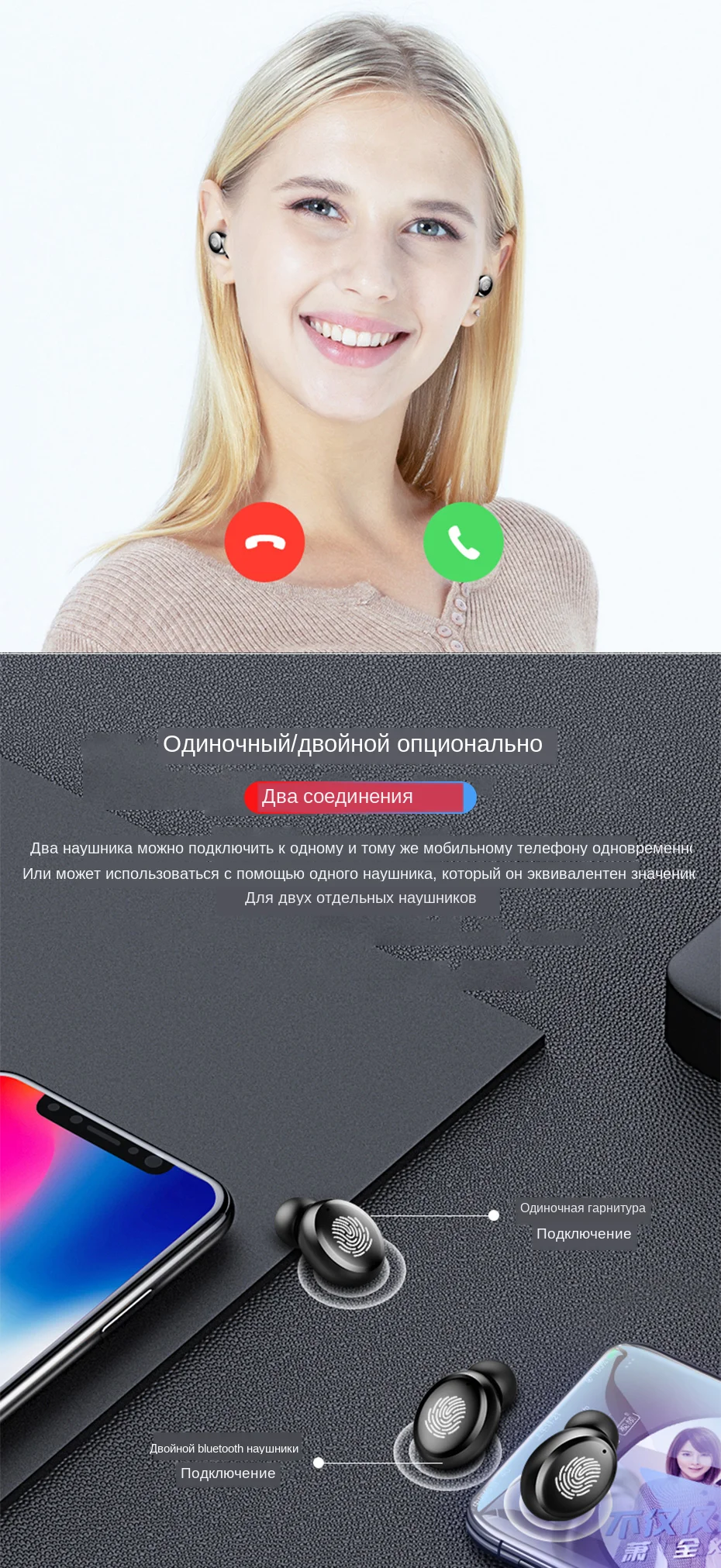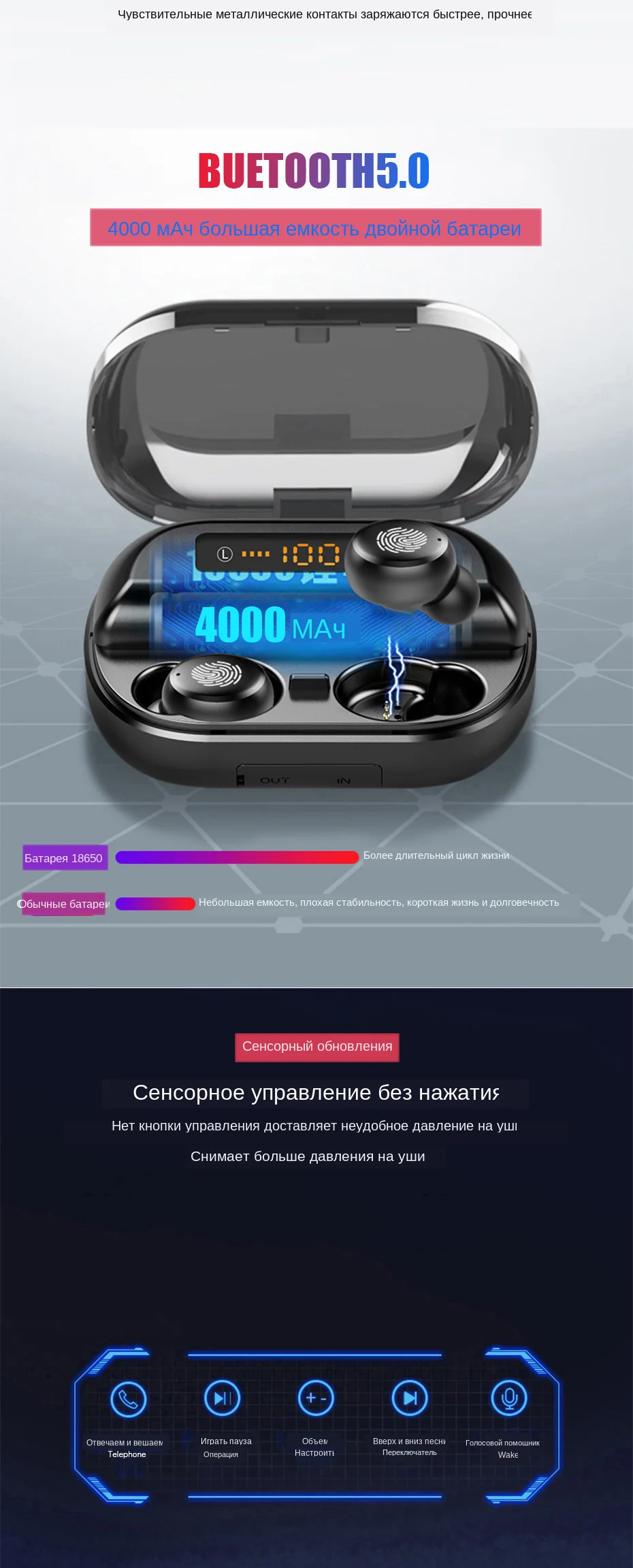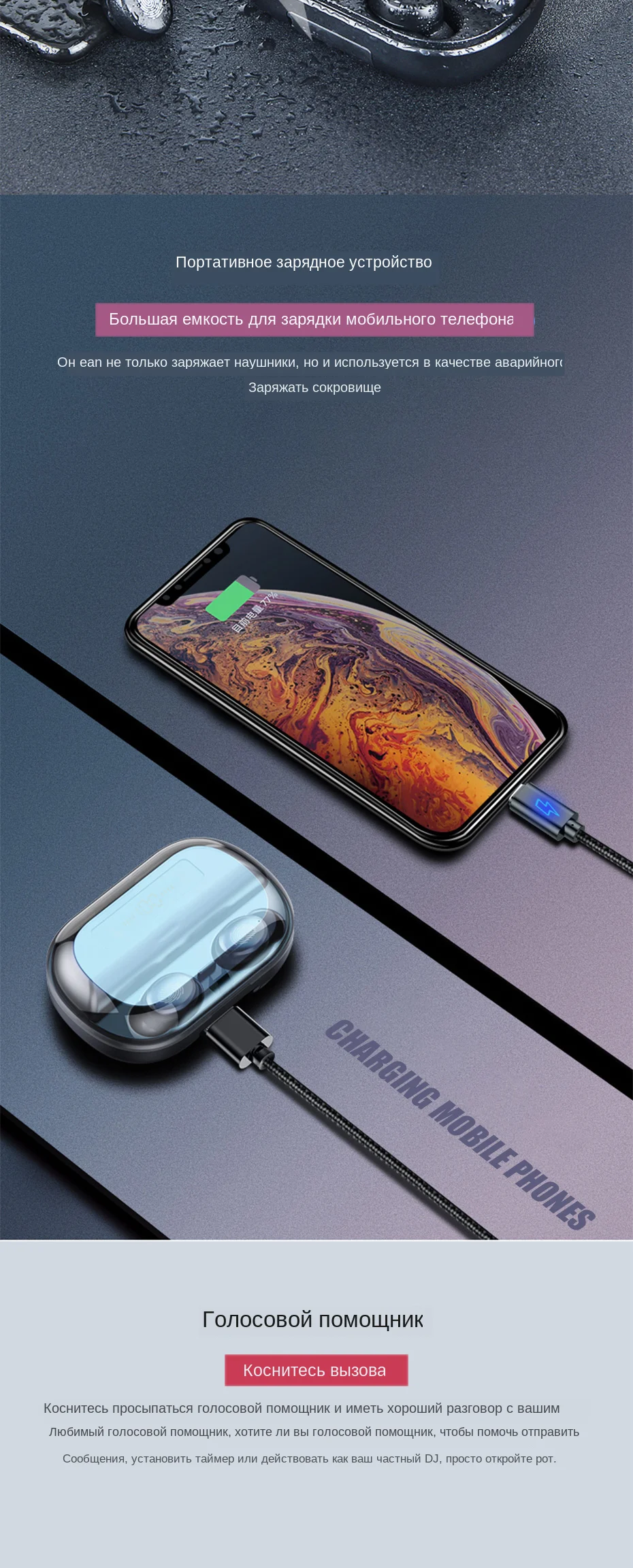CVC8.0 Шум шумоподавления Светодиодный дисплей с регулятором емкости аккумулятора и громкости Смарт-прикосновения Управление Технология Эргономичный дизайн Внешний аккумулятор 2400/4000 мАч IPX7 Водонепроницаемый Уплотнение для зарядки Интерфейс Автоматическое Сопряжение Одиночный наушник/бинауральный звонок 9D объемного звучания Подставка для телефона Голосовой помощник Siri HD стерео вызова Hi-fi звук Технические характеристики: Опции: аккумулятор 2400 мАч/4000 мАч Спецификация bluetooth: 5,0 + EDR Шум сокращения: CVC8.0 Расстояние передачи: 33ft Частотная характеристика: 20-22 кГц 2400 мА/ч, Батарея Время прослушивания музыки: 90 часов Время работы в режиме разговора: 135 часов Порт зарядки: Micro USB Время зарядки: 20 минут Время воспроизведения: до 4 часов Время работы в режиме ожидания: 630 ч 4000 мА/ч, Батарея Время воспроизведения музыки: 380 часов Время работы в режиме разговора: 360 часов Порт зарядки: Micro USB Список продуктов: 1 пара bluetooth-наушников Руководство пользователя-1 шт.; 1 x usb-кабель для зарядки 1 х блок питания