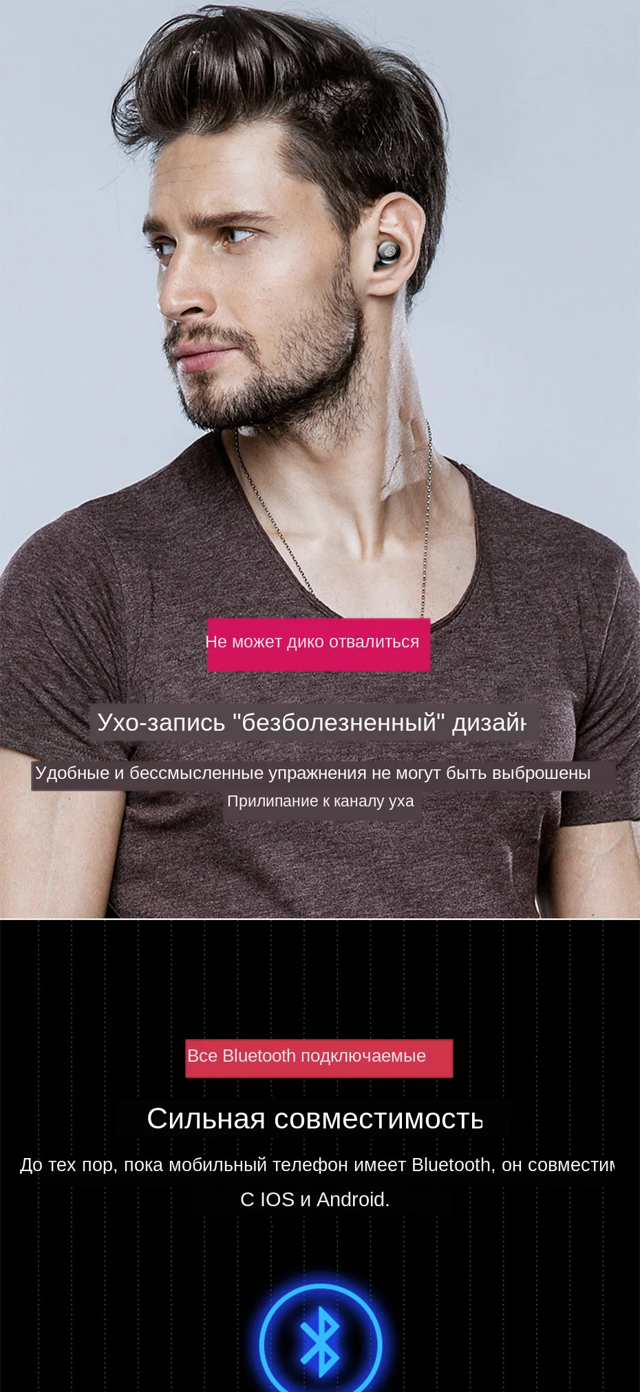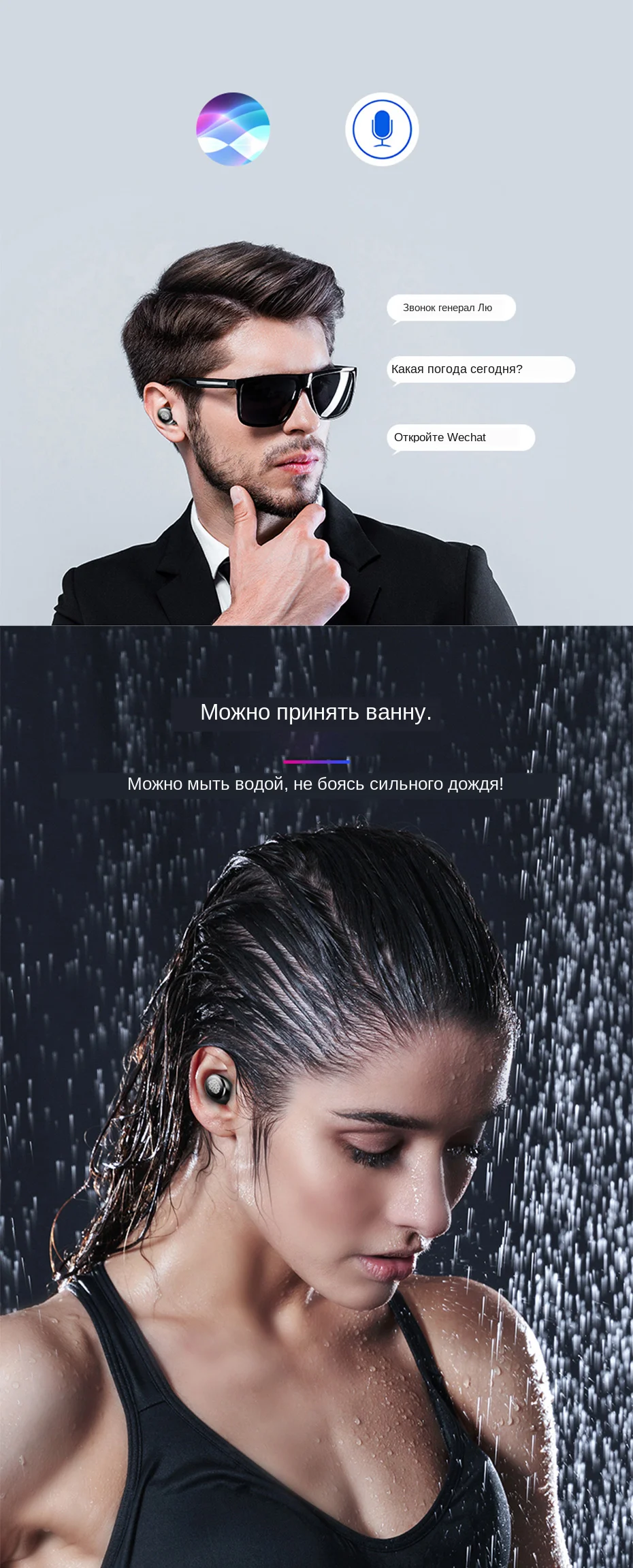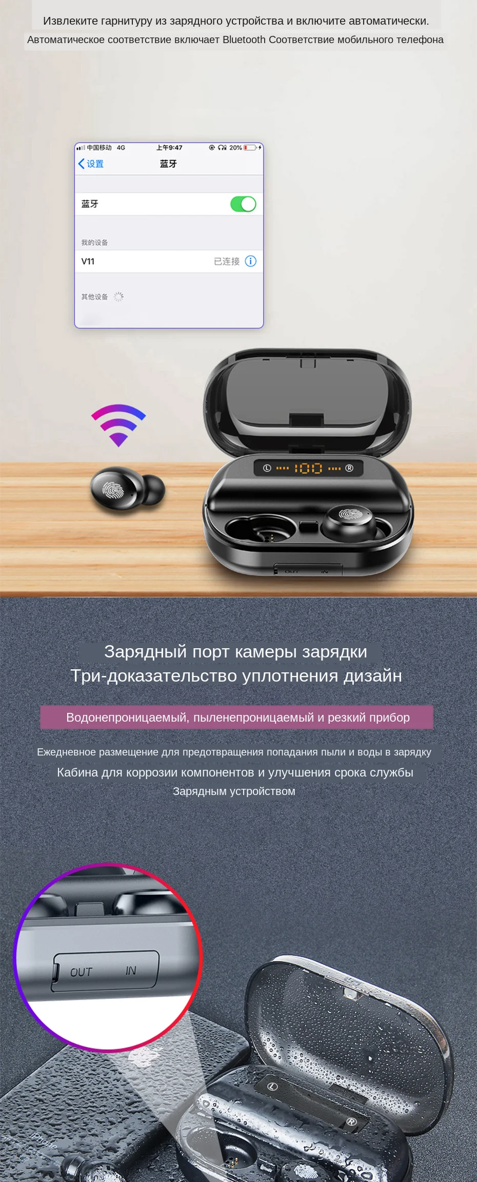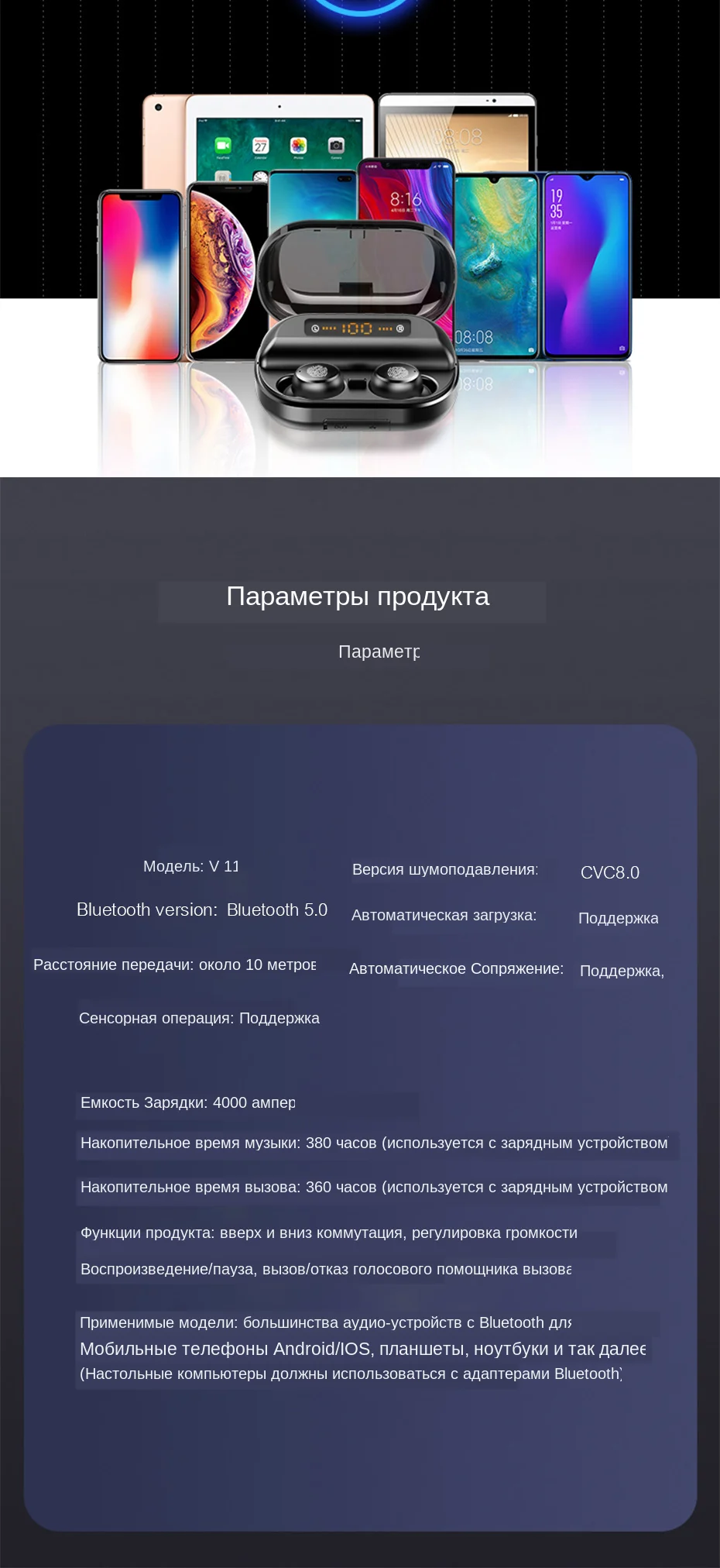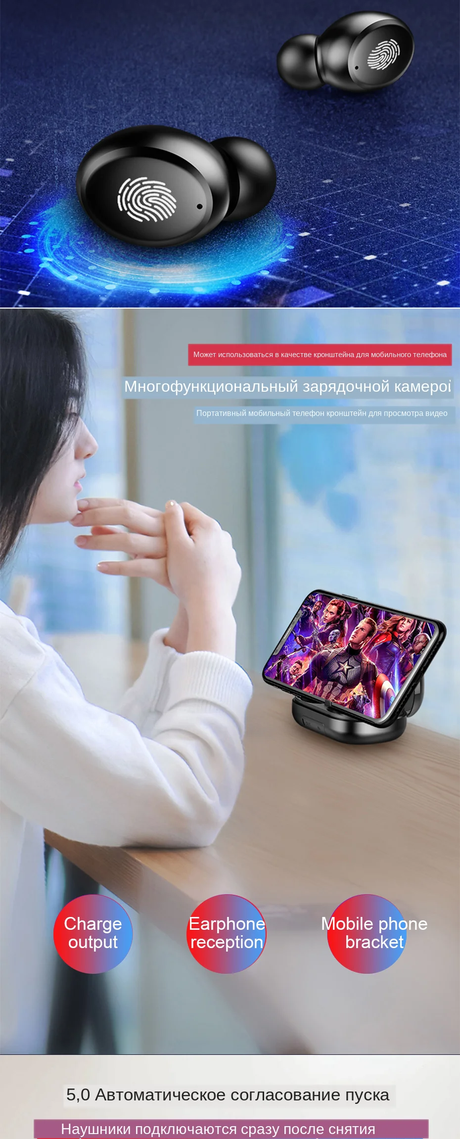 CVC8.0 Шум шумоподавления Светодиодный дисплей с регулятором емкости аккумулятора и громкости Смарт-прикосновения Управление Технология Эргономичный дизайн Внешний аккумулятор 2400/4000 мАч IPX7 Водонепроницаемый Уплотнение для зарядки Интерфейс Автоматическое Сопряжение Одиночный наушник/бинауральный звонок 9D объемного звучания Подставка для телефона Голосовой помощник Siri HD стерео вызова Hi-fi звук Технические характеристики: Опции: аккумулятор 2400 мАч/4000 мАч Спецификация bluetooth: 5,0 + EDR Шум сокращения: CVC8.0 Расстояние передачи: 33ft Частотная характеристика: 20-22 кГц 2400 мА/ч, Батарея Время прослушивания музыки: 90 часов Время работы в режиме разговора: 135 часов Порт зарядки: Micro USB Время зарядки: 20 минут Время воспроизведения: до 4 часов Время работы в режиме ожидания: 630 ч 4000 мА/ч, Батарея Время воспроизведения музыки: 380 часов Время работы в режиме разговора: 360 часов Порт зарядки: Micro USB Список продуктов: 1 пара bluetooth-наушников Руководство пользователя-1 шт.; 1 x usb-кабель для зарядки 1 х блок питания