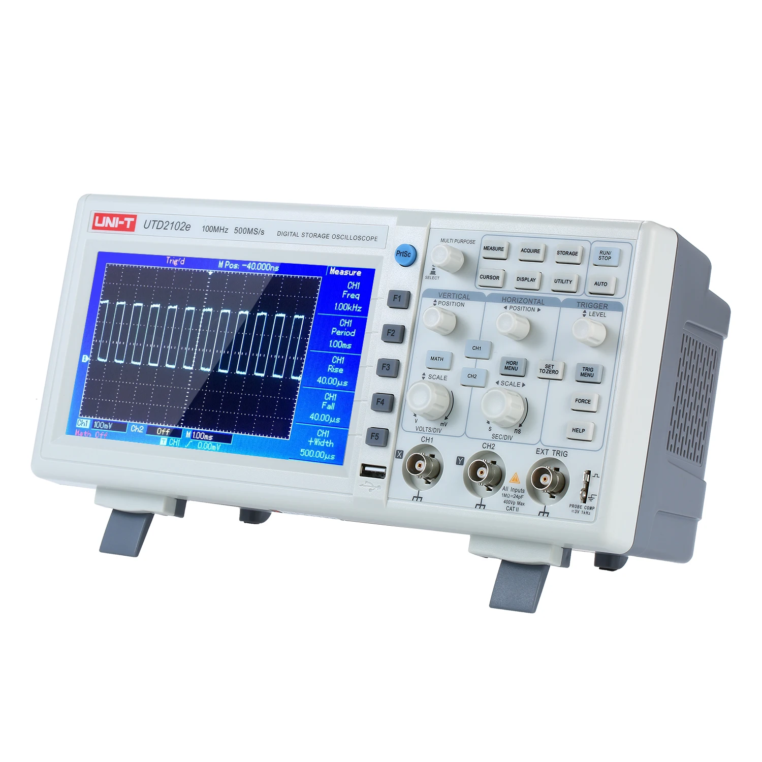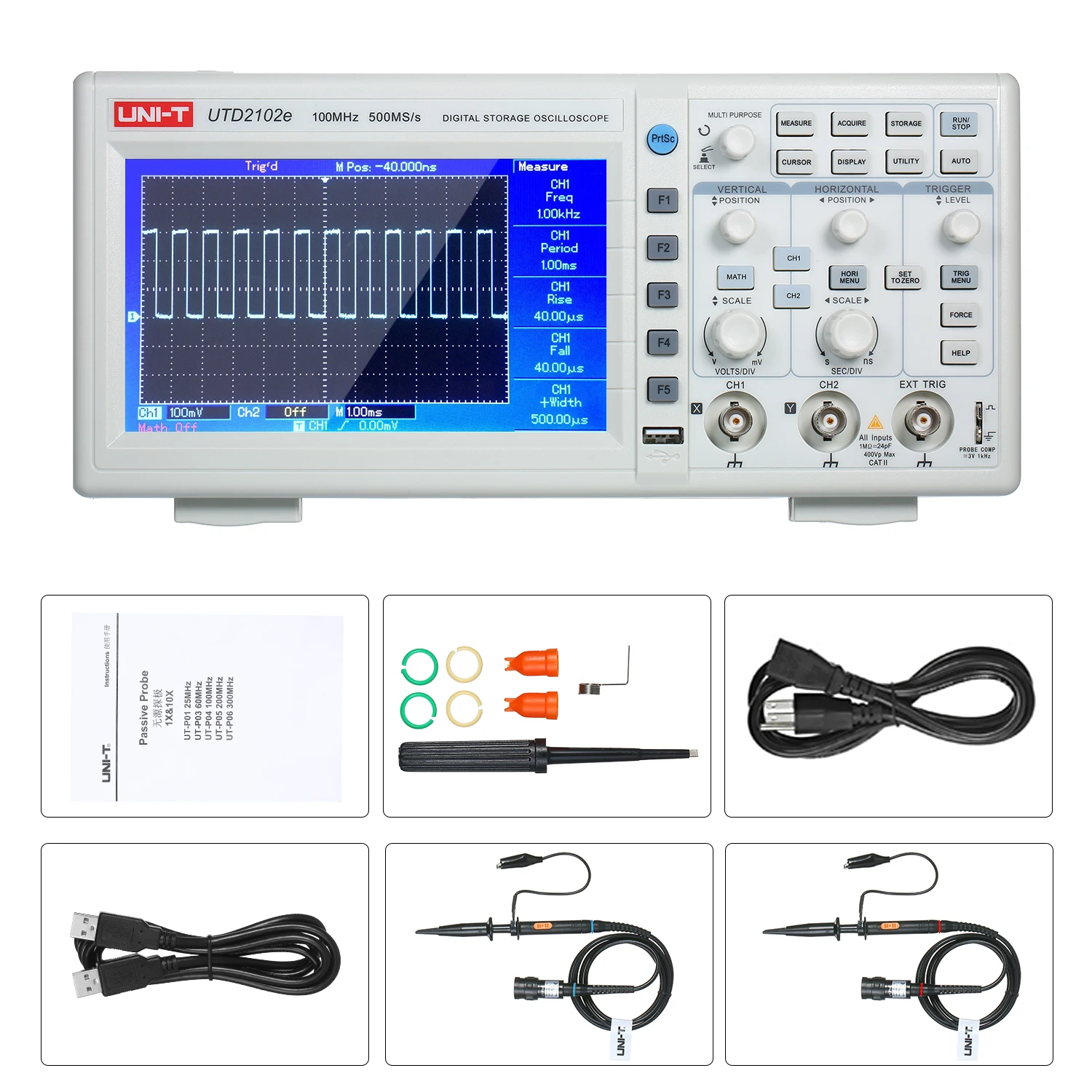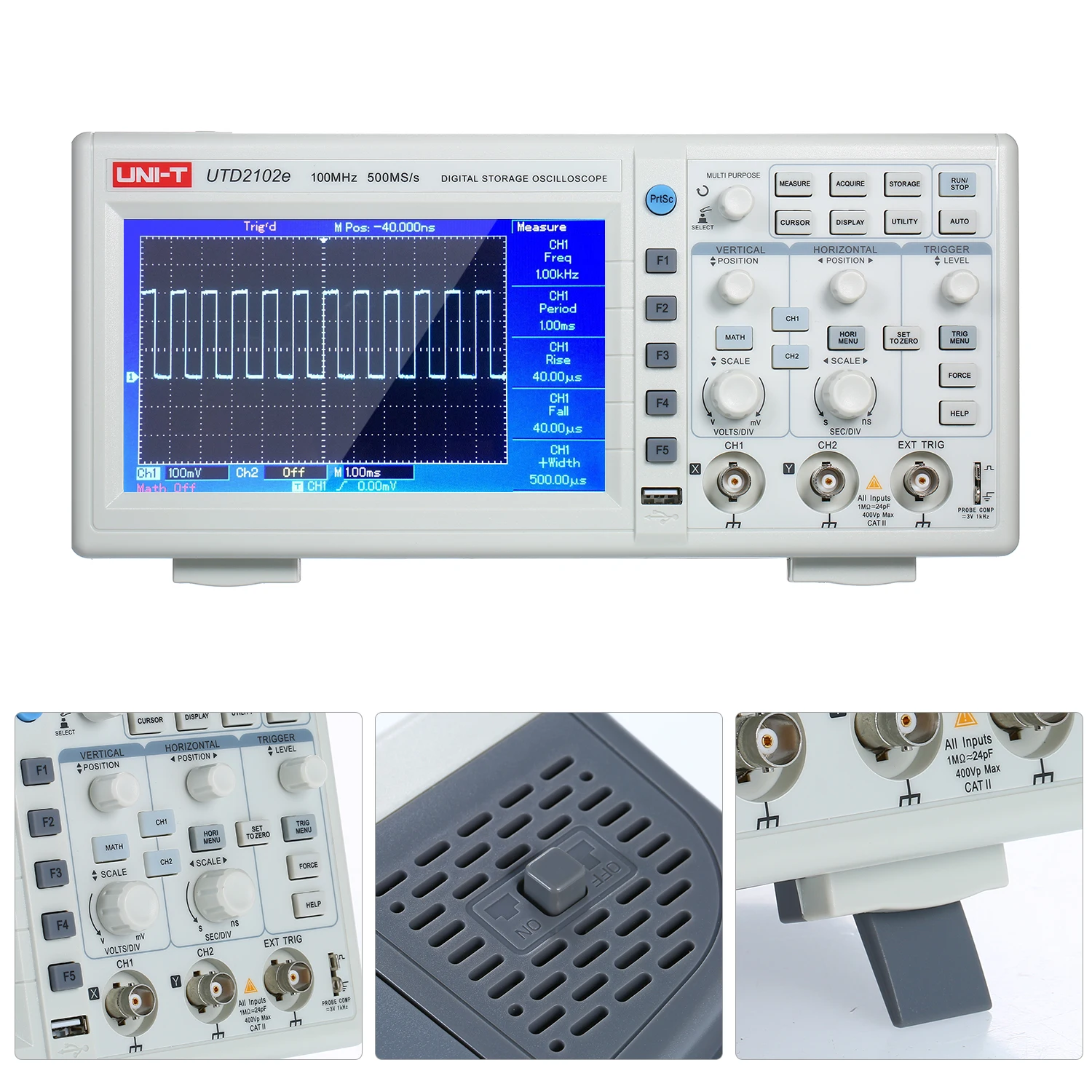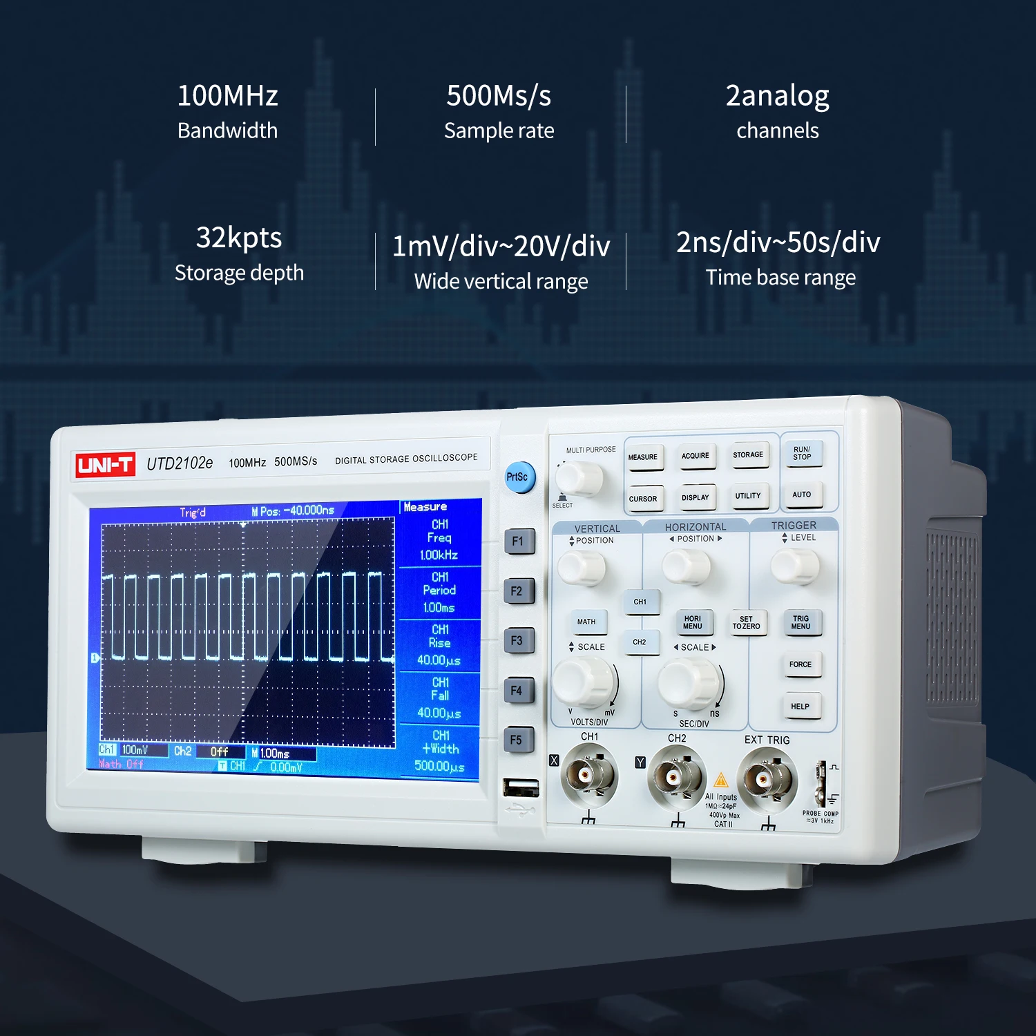 UNI-T UTD2102e цифровой осциллограф с большим 7 "дисплеем и 100 МГц полоса пропускания, 32K длина записи для 2 канала с самой высокой 500 мс/с частота дискретизации. Это широко используемый электронный измерительный инструмент, может трансформировать невидимые электрические сигналы в видимые изображения, чтобы люди могли изучать изменения различных электрических явлений.