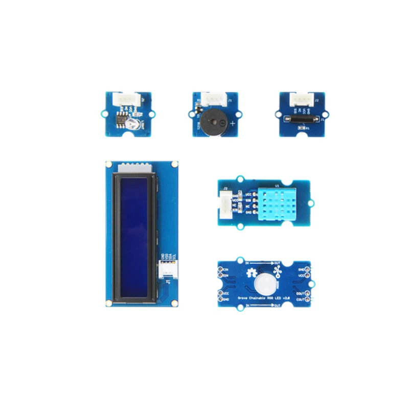 1 x Seeeduino Lotus v1.1 1 x переключатель наклона 1 зуммер 1 х датчик температуры и влажности (DHT11) Цифровой Акселерометр, 3 оси, 1 шт. Светильник-1 шт. 1 x Line Finder 1 х светодиодный rgb-сигнал 1x16x2 LCD (белый на синем)