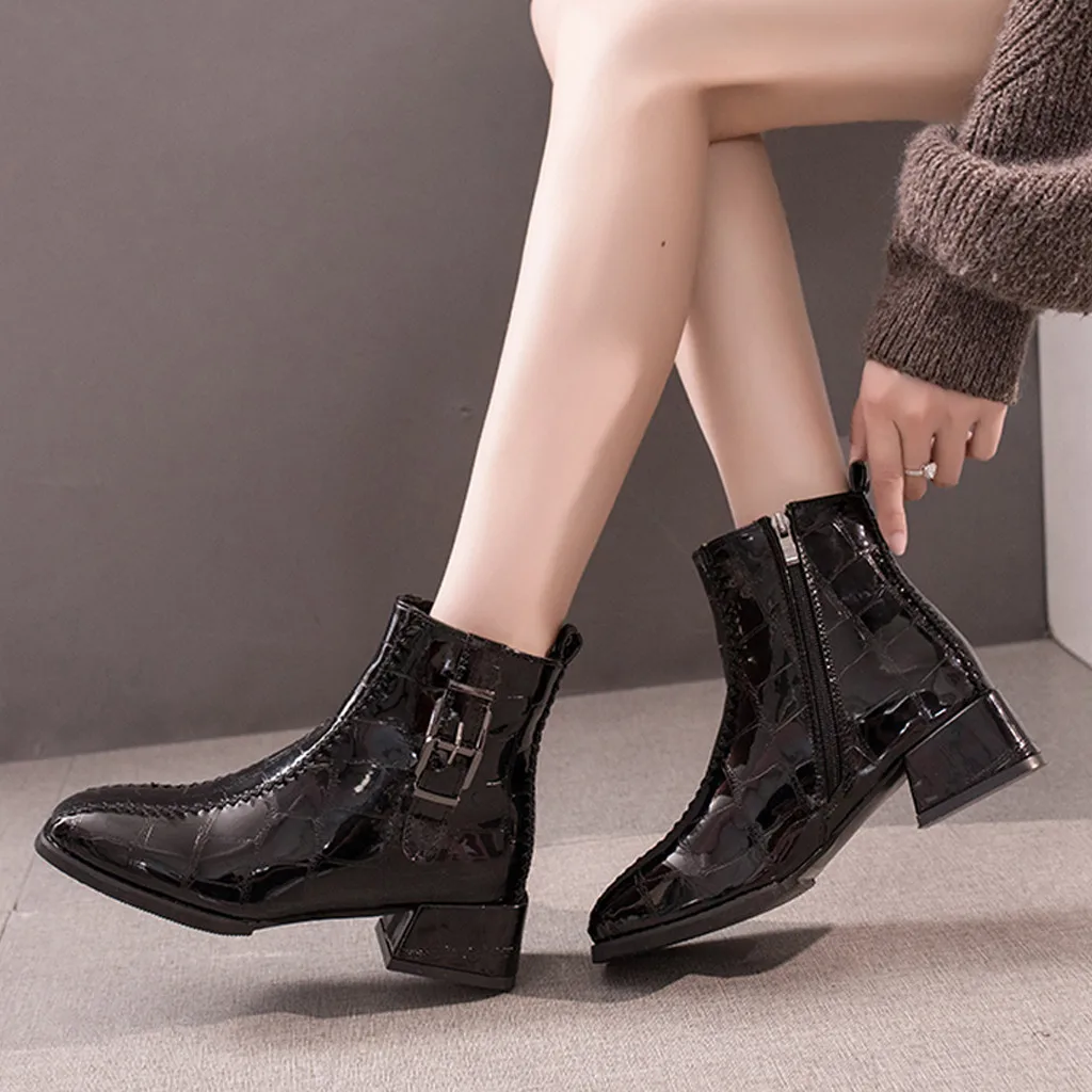 Женские зимние ботинки с ремешком и пряжкой; повседневная обувь на высоком квадратном каблуке с боковой молнией