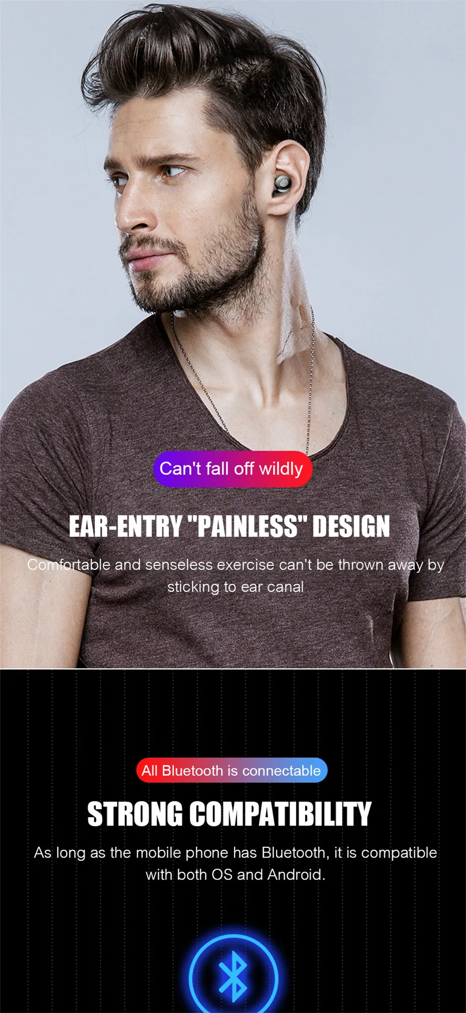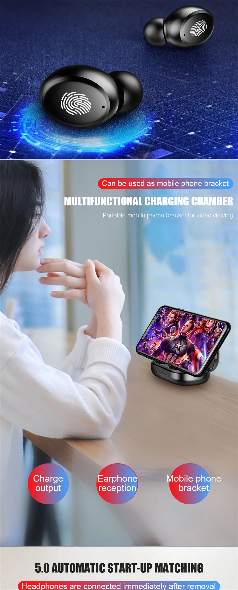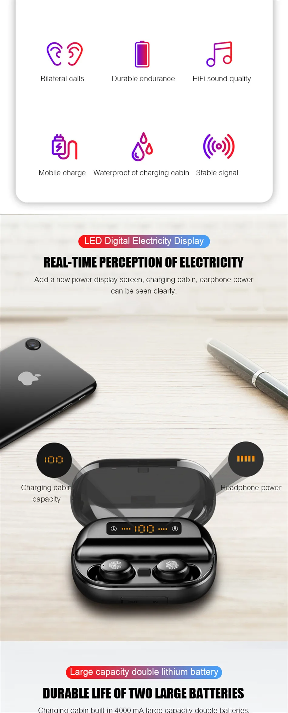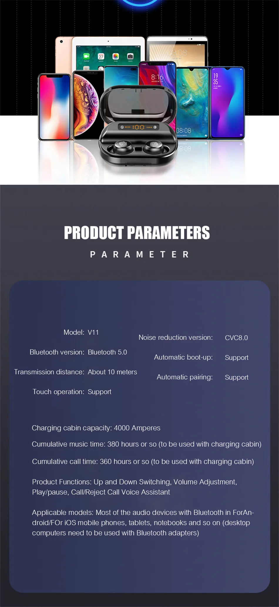 Параметры: Тип: беспроводные наушники Количество: 1 шт. Материал: пластик + электрический компонент Цвет: черный Модель: обычная модель/усовершенствованная модель Версия Bluetooth 5,0 Поддержка соглашения: Поддержка HFP 1,7, HSP 1,2, A2DP 1, AVRCP1.6, SPP 1,2 и PBAP 1,0 Батарея: 18650 батарея Время разговора: около 3-4 ч (полная мощность одного наушника) Время прослушивания песни: около 3-4 ч (полная мощность одного наушника) Тип аккумулятора наушников: 3,7 в, 50 мА · ч Входной ток: 5 В 1000 мА Входной ток наушников: 5 В 100 мА Мобильный выходной ток: 5 В 1000 мА Емкость зарядного аккумулятора: Расширенный model-4000mAh Обычная модель-2400 мАч Вес нетто: 150g/5,29 oz