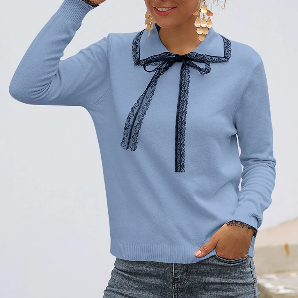 2019 женские свитера, Женский Повседневный однотонный вязаный свитер с длинным рукавом и бантом, топ, блуза, свитер, damski