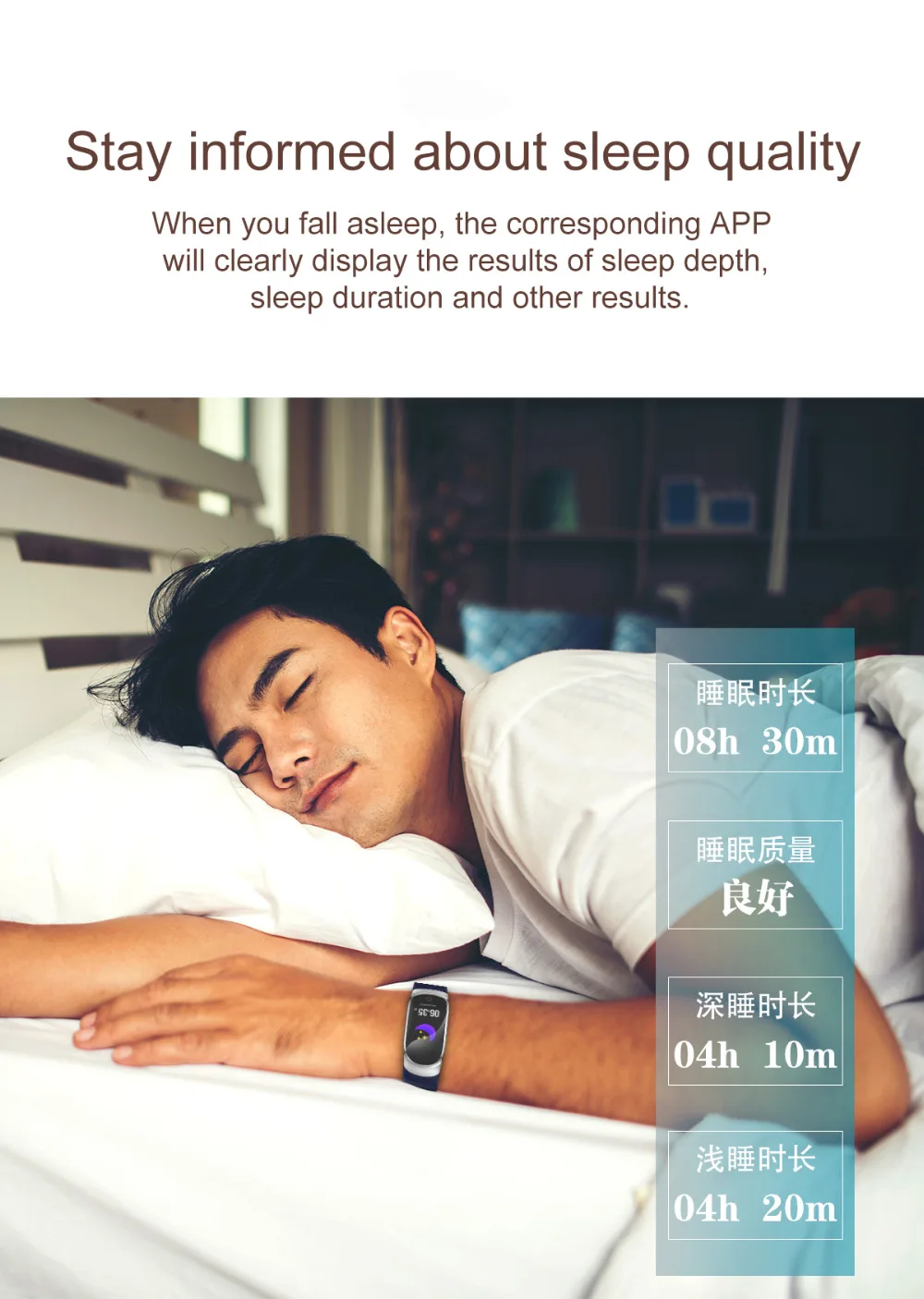 motion count step; movement distance ; calories; WeChat ; QQ ; Micro-Blog Reminders: Incoming call name Notification Support: Wechat QQ Facebook Twitter WhatsApp Skype Instagram and so on Size: 0.96 inch IPS Interactive Mode: Single Touch Bluetooth: Bluetooth LE 4.0 Android requirement: Android 4.4 above iOS requirement: iOS 8.2 above 24 hour Heart Rate Package Including: 1 x Smart Bracelet(with original box) 1 x USB Cable 1 x Manual