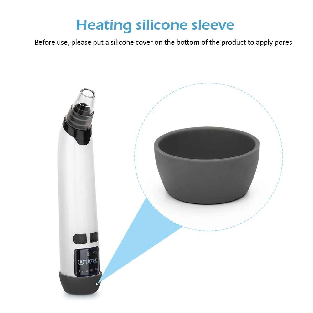 7. Нижняя часть устройства для удаления черных точек оснащена силиконовым рукавом. При использовании функции нагрева, пожалуйста, наденьте силиконовый рукав, чтобы предотвратить попадание воды в порт зарядки и посторонние предметы. Во время зарядки вы можете снять силиконовый чехол для зарядки!