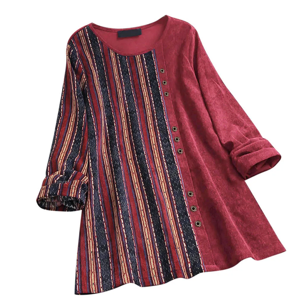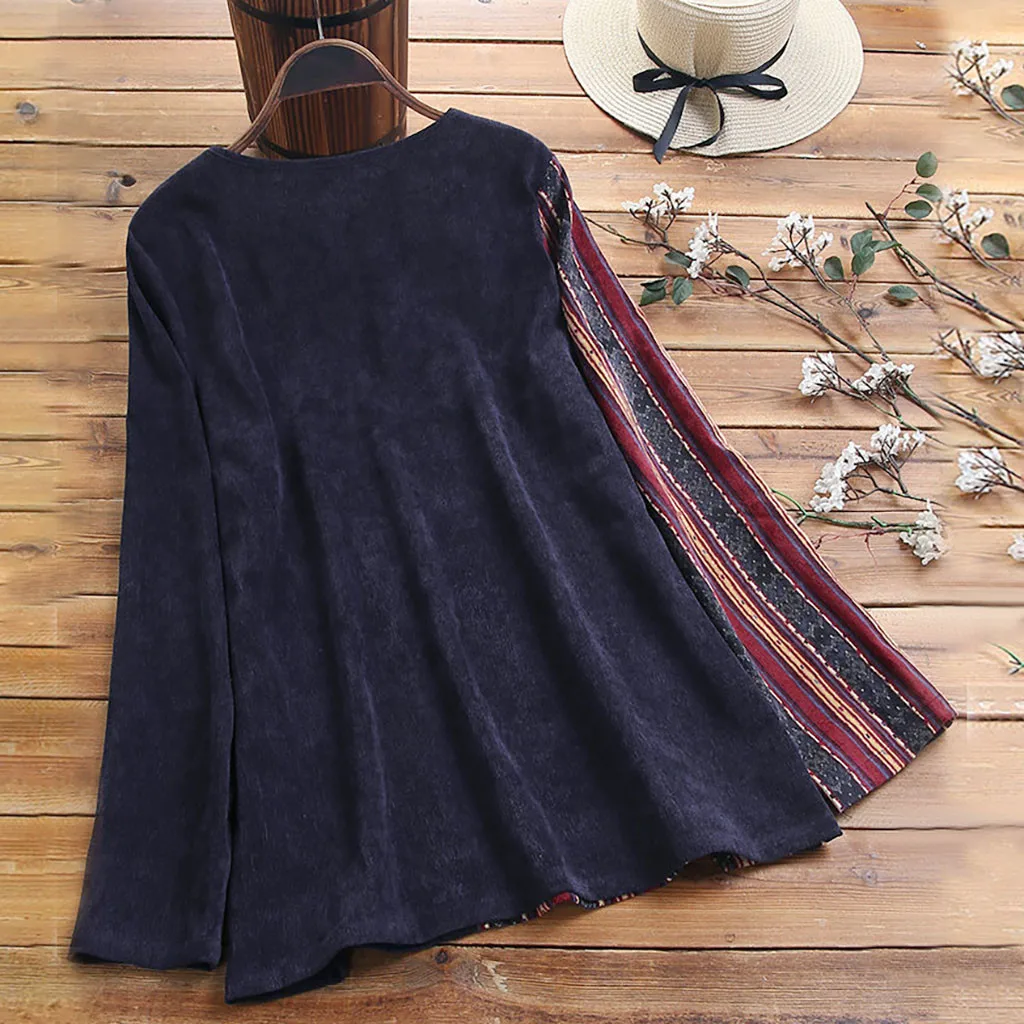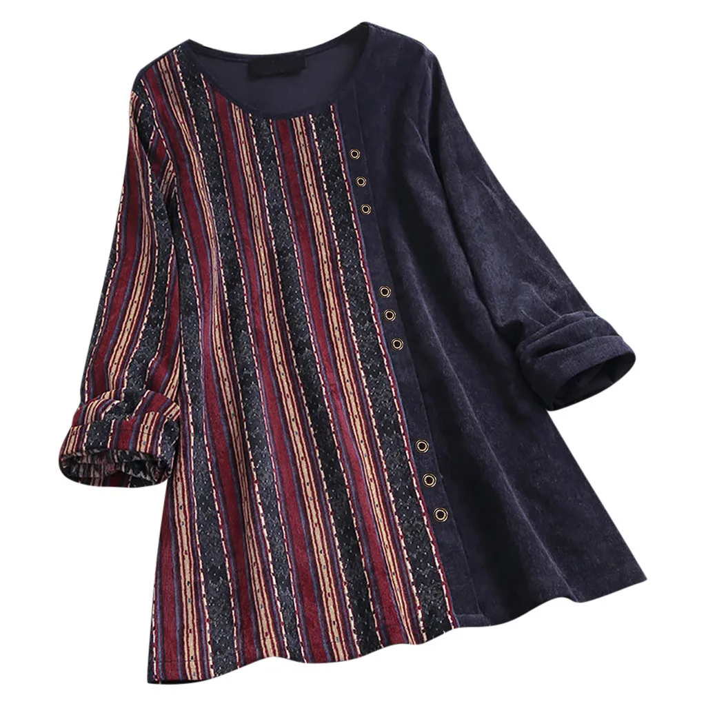Женский вельветовый Полосатый Принт пэчворк длинный рукав винтажный Топ Футболка Блузка