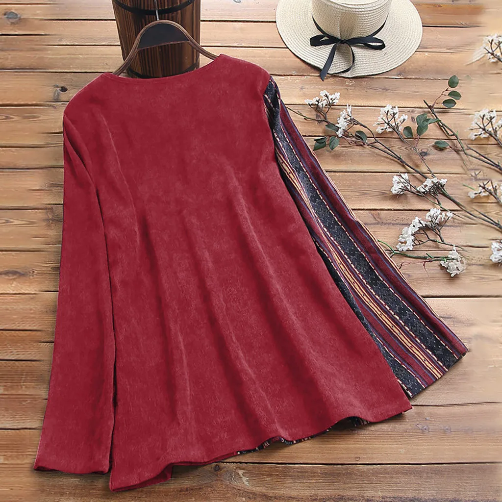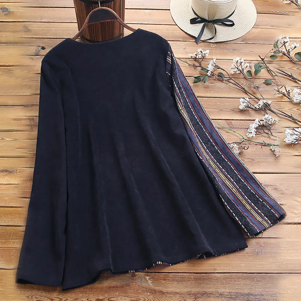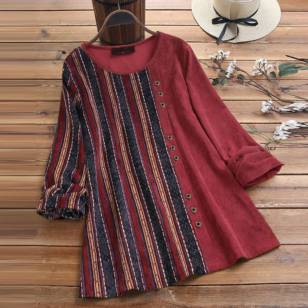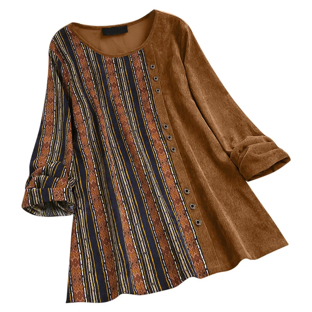 Женский вельветовый Полосатый Принт пэчворк длинный рукав винтажный Топ Футболка Блузка